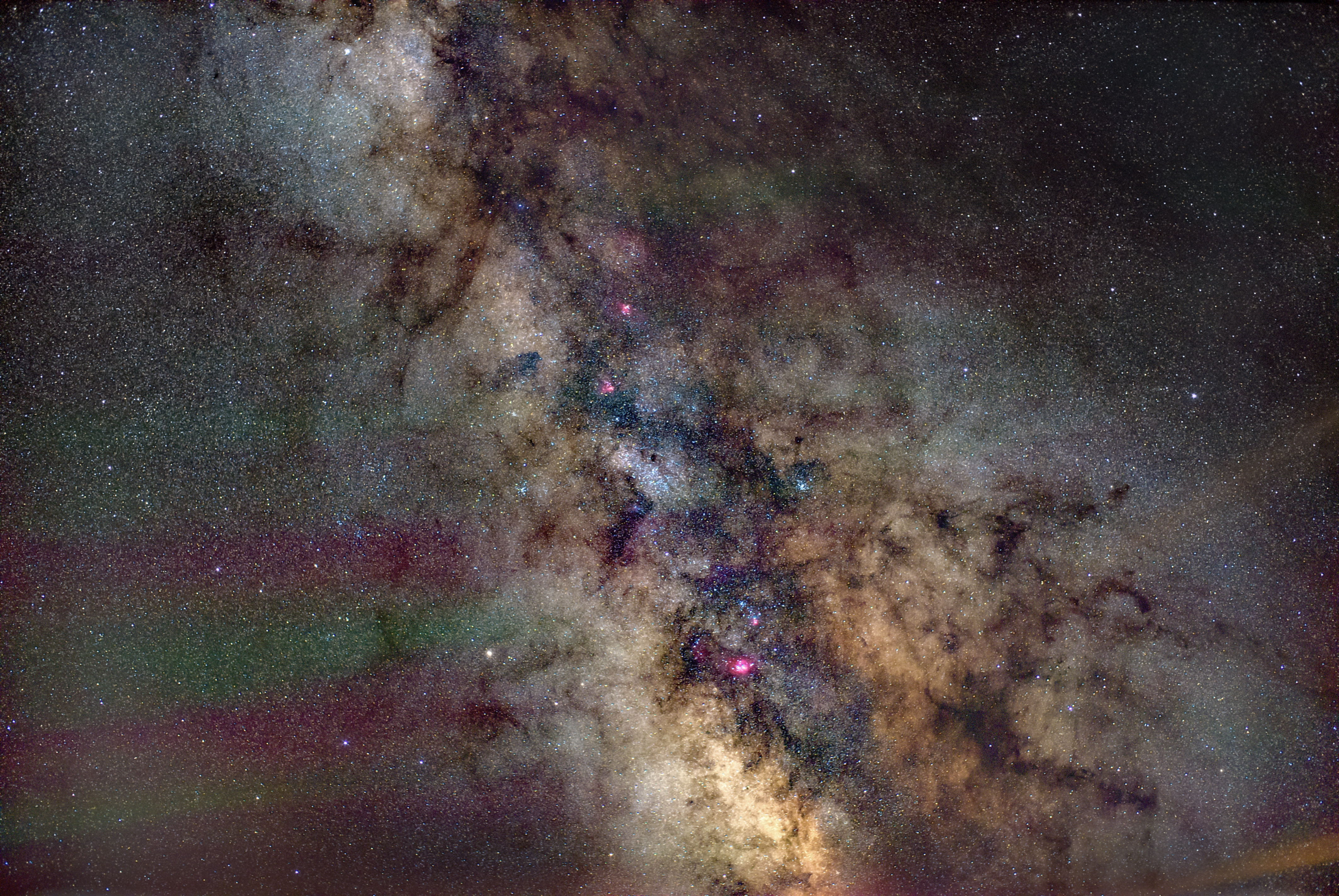 Hier das Milchstraßenzentrum vom 26. Juni 2020 von der Wasserkuppe im Sternenpark Rhön. Aufnahmedaten: Sony A7s 125x 6sec.; Zeiss Planar 50 mm, Blende 2,8, ISO 12800. Leider auch hier die störenden Airglow-Bänder zu sehen. Bearbeitet mit Sequator und Photoshop.