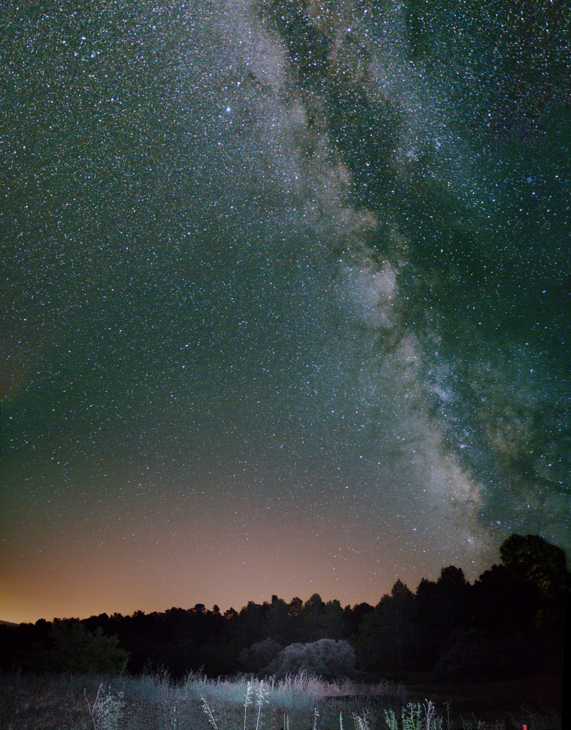 The brightest part of the Milky Way, near the constellation of Sagittarius, rises over South horizon from the Hoya Redonda homestead in Valencia, Spain, on June. Toward southeast the reddish brightness of the skyglow come from light pollution of Ontinyent city zone.