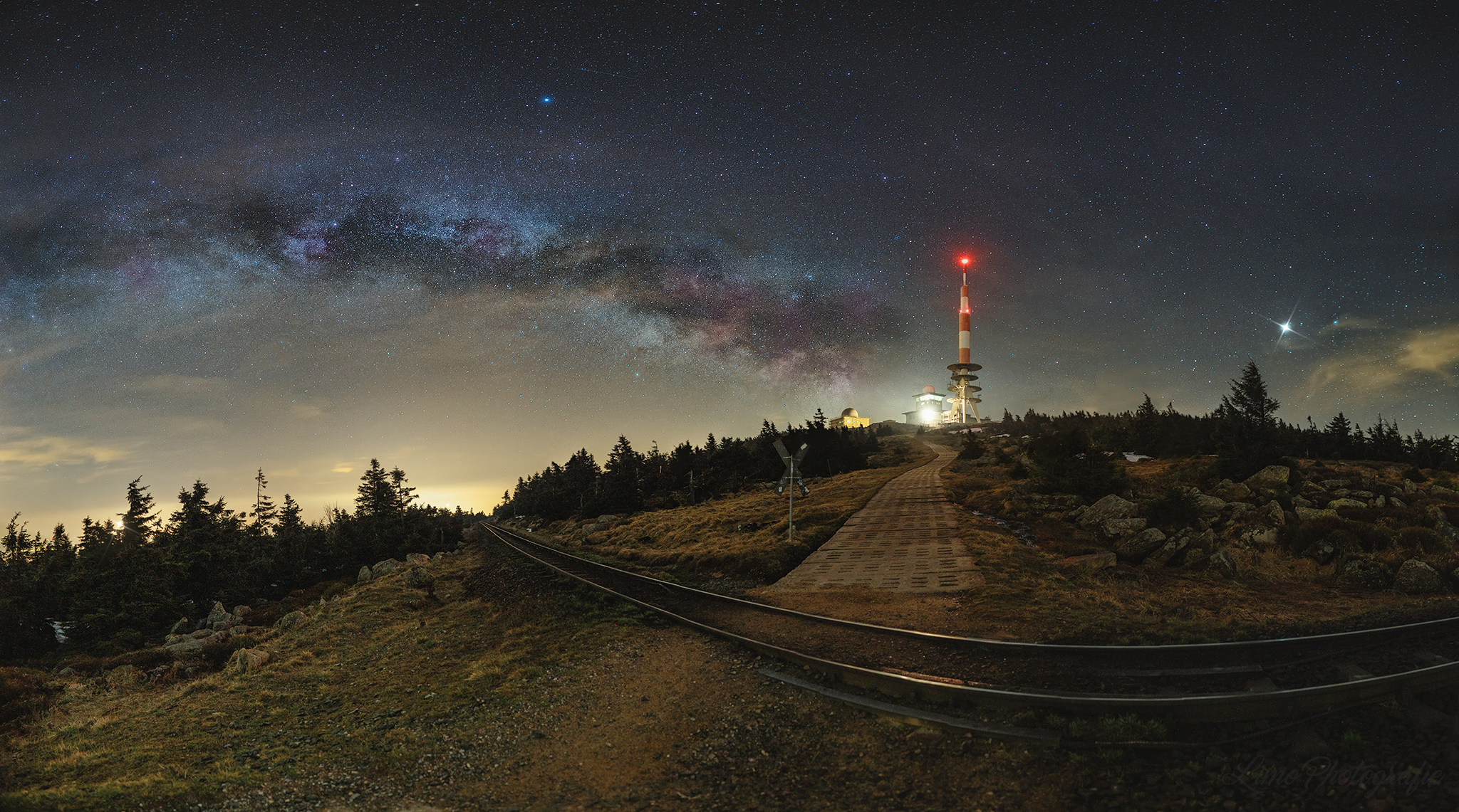 Milchstraße am Bahnübergang "Hirtentieg" auf dem Brocken. Panorama aus 3 x 2 Fotos, à 10 sec. bei ISO 6400 und Blende 2.0.