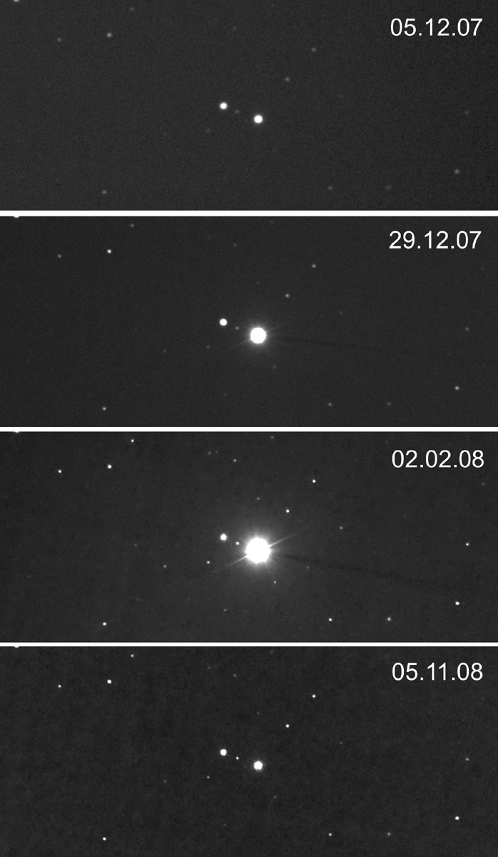 Die extremen Helligkeitsschwankungen des langperiodischen Roten Riesen "Mira" im Sternbild Walfisch konnte ich 2007/2008 in 11 Monaten viermal festhalten. Und zwar am 5. Dezember 2007, 29. Dezember 2007, 2. Februar 2008 und 5. November 2008. Die Helligkeit schwankt innerhalb von 331,6 Tagen meist von etwa 3 mag bis 12 mag.
