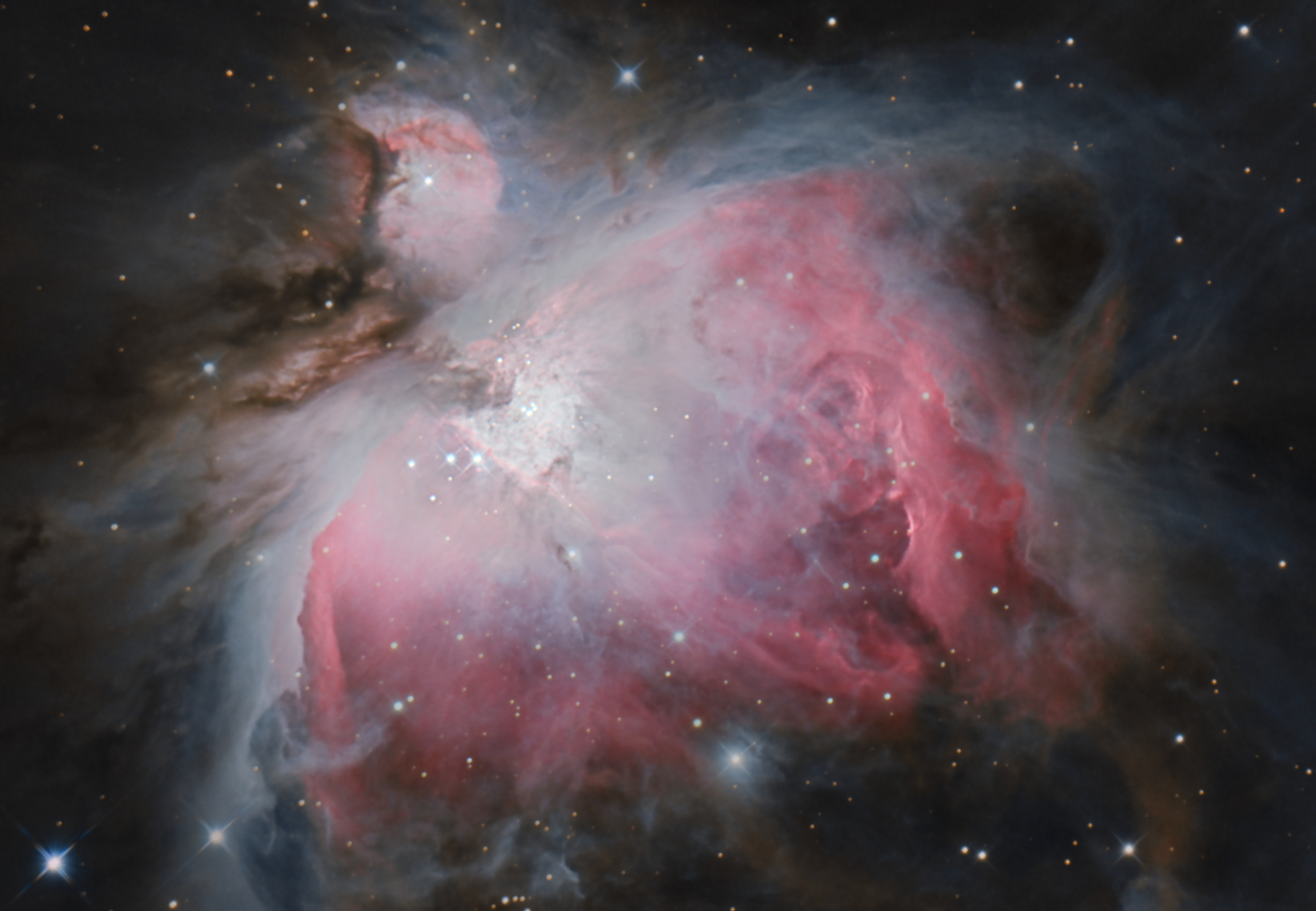 Den Orionnebel kennt wohl jeder Hobby-Astronom und Astrofotograf. Aber nicht sehr oft wird mit richtig langer Brennweite ein Bild versucht. Hier habe ich es mal probiert und knapp dreieinhalb Stunden lang mit einem 8-Zoll-Ritchey-Chrétien draufgehalten. Nach viel Mühe in der Bildbearbeitung kann ich dieses Ergebnis präsentieren. Der Orionnebel M 42 ist ein Emissionsnebel, der vorwiegend aus Wasserstoff besteht, und eines der aktivsten Sternentstehungsgebiete am Nachthimmel. Schon seit Jahrhunderten wird er von Astronomen ausgiebig untersucht.