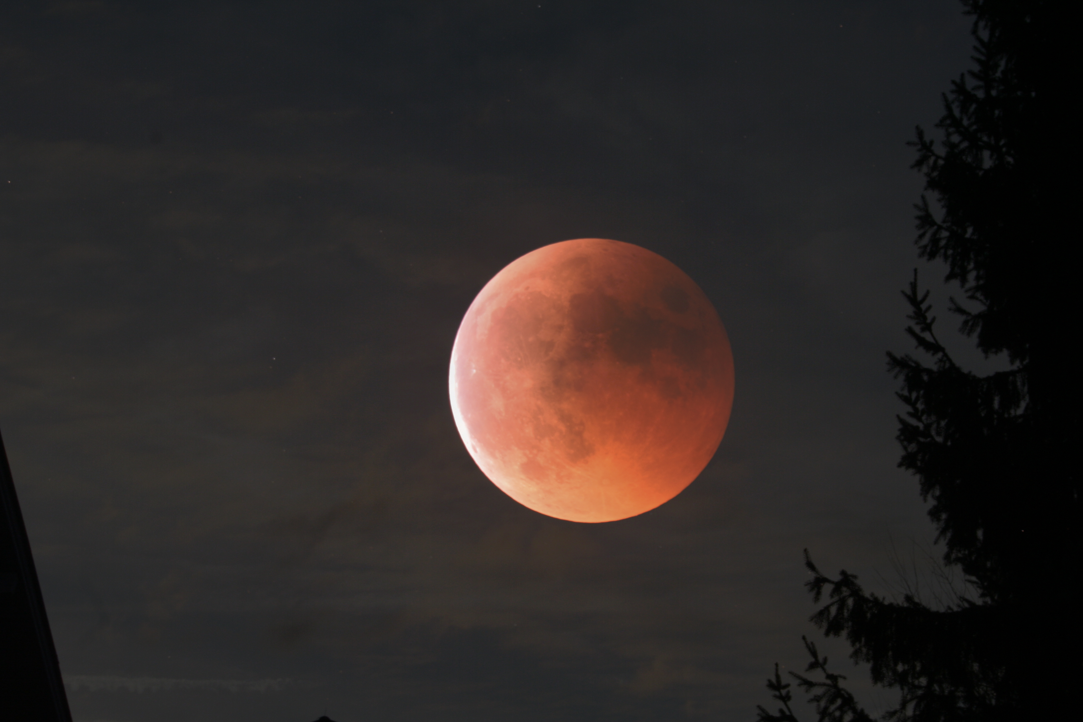 Die Wartezeit, bis der verfinsterte Mond über dem gegenüberliegenden Wald aufgegangen ist, hat sich bezahlt gemacht, dies ist eines von mehreren Bildern. Ich glaube, dass die Schönheit dieser Mofi hier wirklich eindrucksvoll zum Ausdruck kommt.