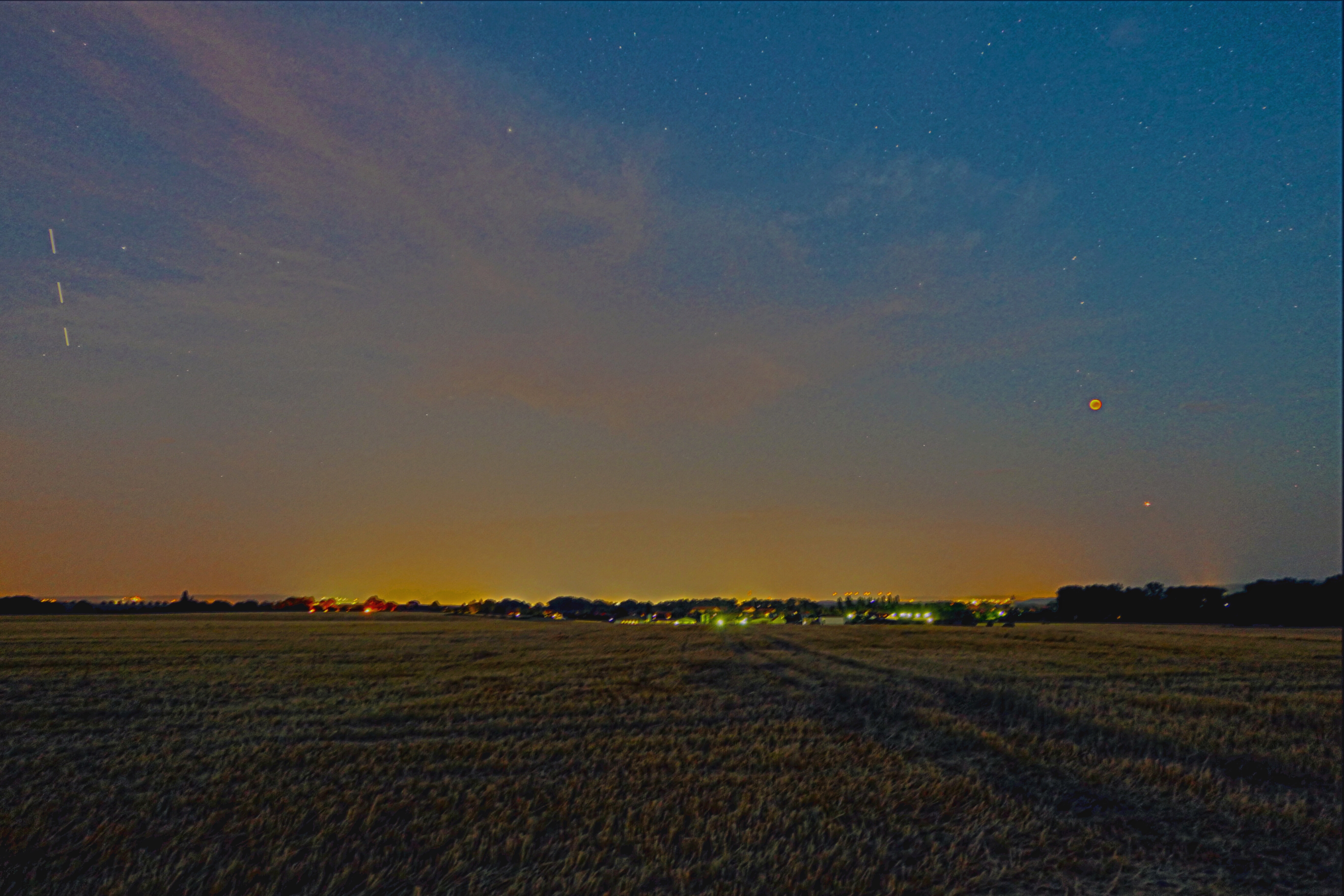 Mofi 2018 mit Mars und ISS. Aufgenommen bei den Drei Gleichen Nähe Erfurt mit Lumix LX15 3 Aufnahmen a‘ 3s. Trotz Gewitter eine Stunde zuvor noch mal Glück gehabt.