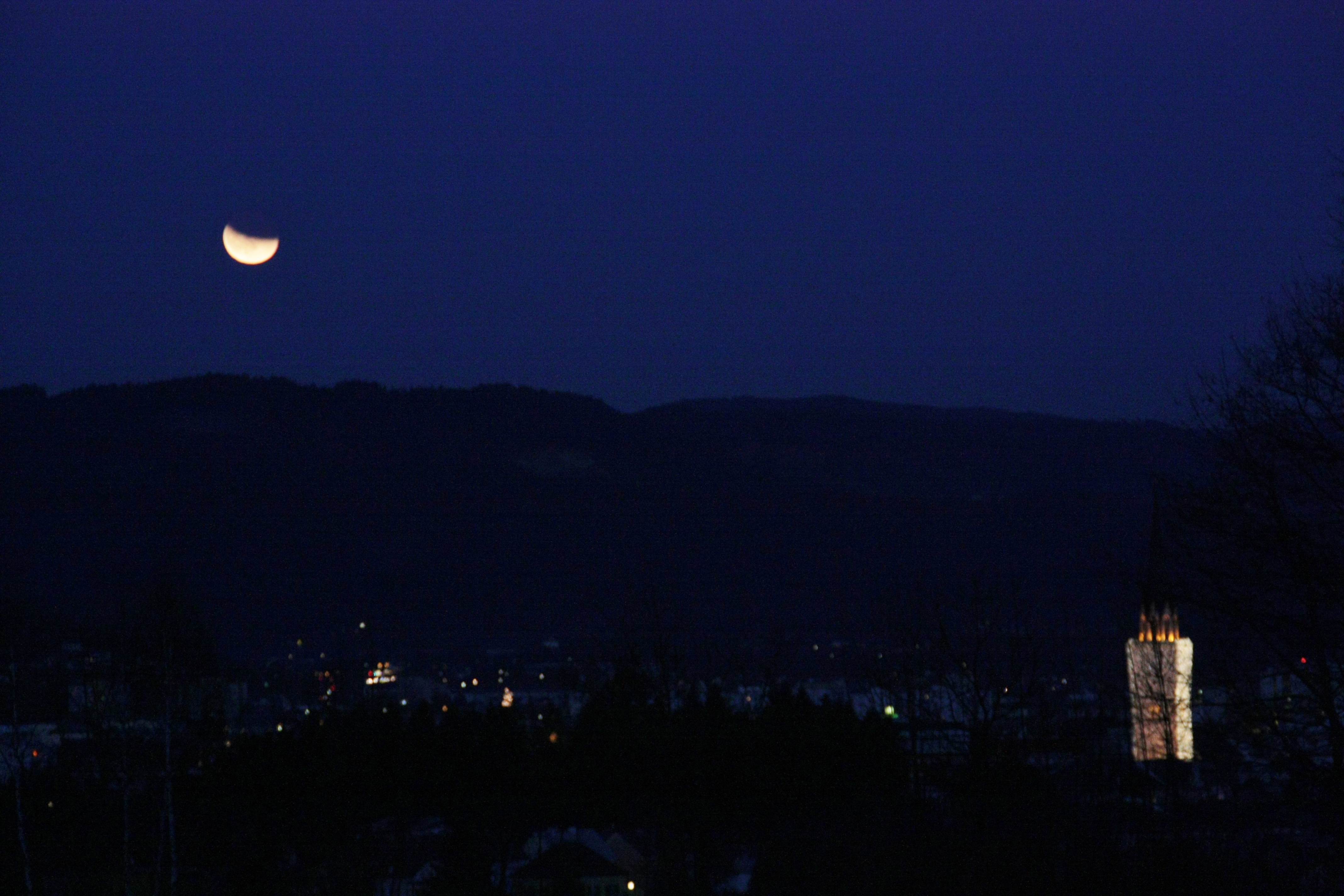 Mondfinsternis, im Süden Österreichs aufgenommen. Die Stadt im Vordergrund ist Villach, mit weihnachtlich beleuchteter Kirche.