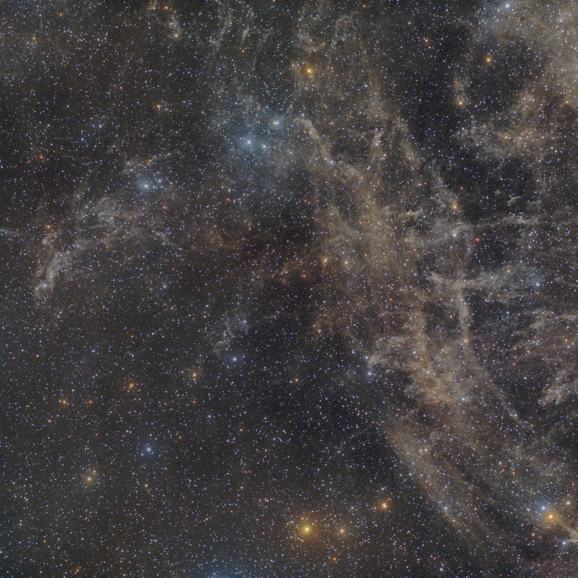 MBM 46-48 are faint molecular clouds located about 375->415 parsec from our solar system. These types of clouds are found at high galactic latitudes (parts of the sky away from the plane of our Milky Way Galaxy) and are often referred to as galactic cirrus clouds or also the "Integrated Flux Nebula". These clouds are very faint and consume a lot of exposure time. All these IFNs were discovered by the IRAS infrared satellite. In 1985, astronomers Magnani, Blitz and Mundy (MBM) surveyed these IFN on the IRAS images and developed their MBM catalog of high galactic latitude molecular clouds. MBM 46-48 are the more distant of these IFN clouds. Also you can find some objects from the PGCC catalog (Planck Catalogue of Galactic Cold Clumps) in this image. These objects are identified in the PGCC annotated image. Because the PGCC detection method is based on the temperature of the sources, which is relatively cold compared to their environment, the low temperatures are a proxy for high column densities and also exclude the possibility of very strong internal heating. The Planck clumps contain higher density substructure, including gravitationally bound pre-stellar and proto-stellar cores.