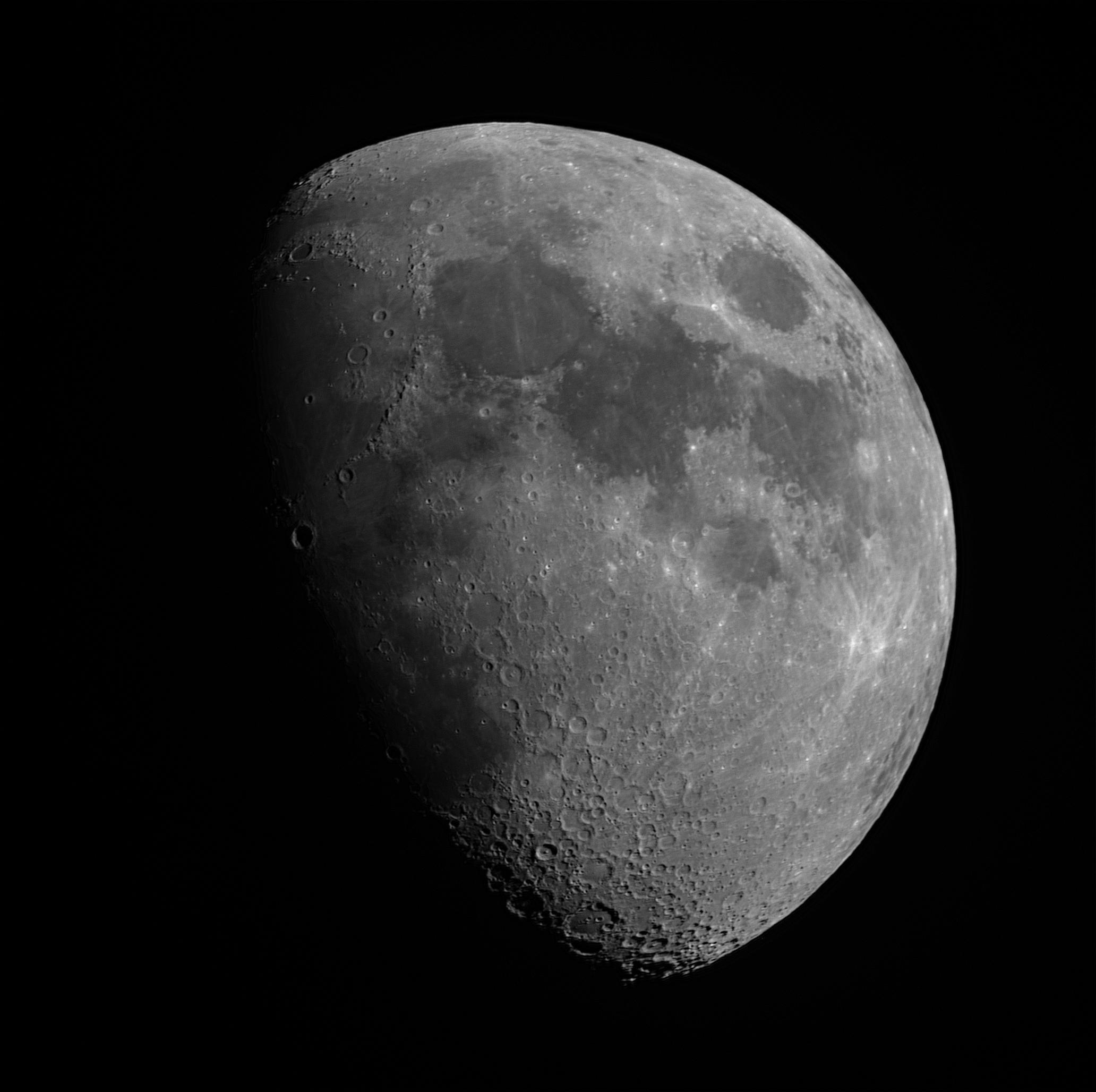 Am 1. März 2023 habe ich den Mond mit dem Astromedia-Baumarkt-Teleskop aufgenommen. Dieses Fernrohr hat eine Linse mit 40 mm Öffnung und einer Brennweite von 450 mm. Selbstverständlich können von einem solch kleinen Bastelfernrohr für unter 20€ keine Wunder erwartet werden, dennoch finde ich es durchaus erstaunlich, wie viel mit heute üblicher Bildbearbeitung noch herausgeholt werden kann. Insbesondere auch der Blick zurück auf erste eigene Mondaufnahmen mit deutlich besseren Objektiven oder Fernrohren ist da sehr lehrreich. Um den Farbfehler zu unterdrücken, wurde vor der Kamera ein Grünfilter benutzt, eine Schwarzweisskamera wäre da sicherlich noch etwas besser gewesen.