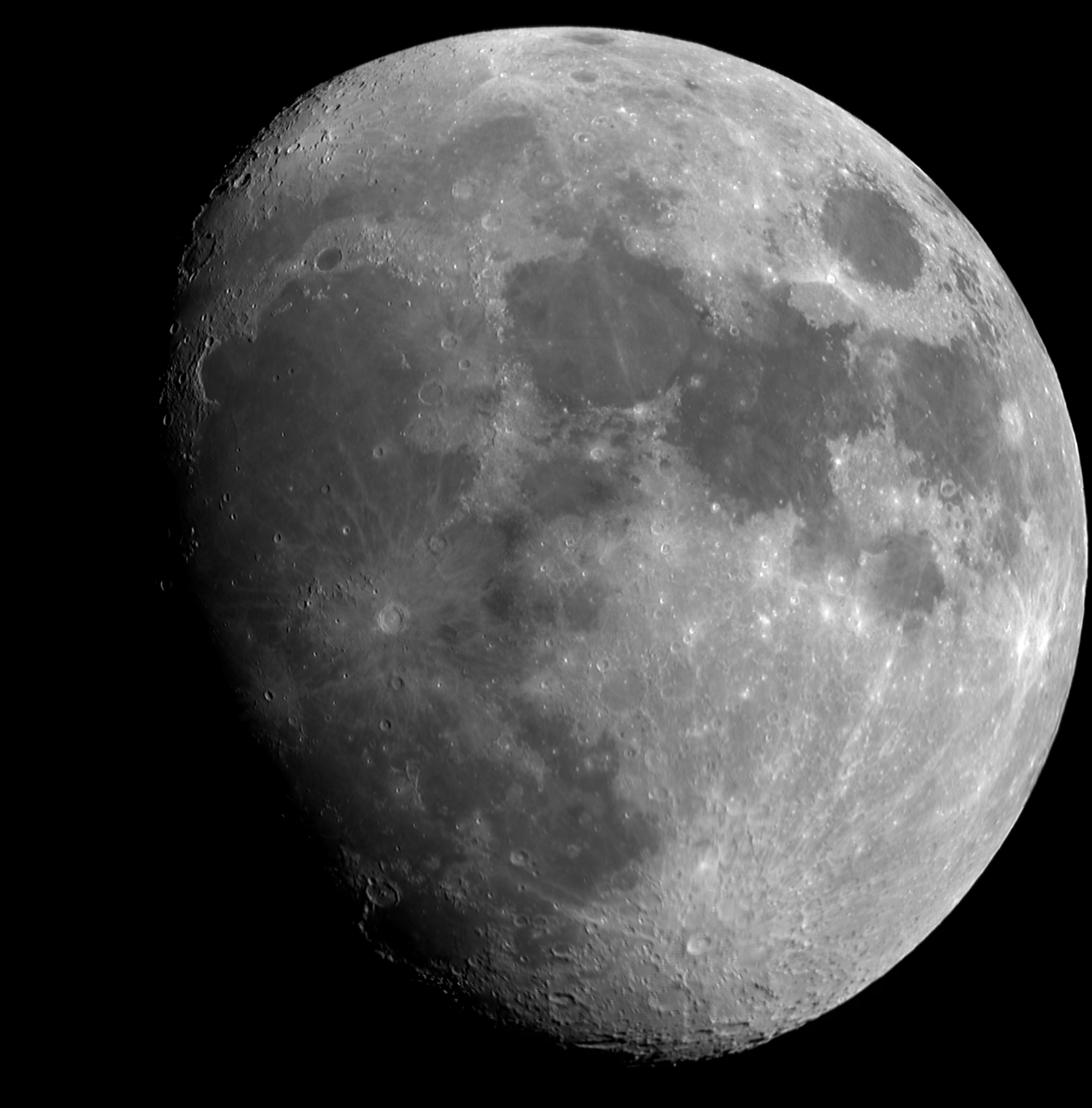 Unser Mond, aufgenommen durch ein Acht-Zoll-Newton-Teleskop von Celestron mit einer Webcam. Es besteht aus einem Mosaik von acht Bildern.