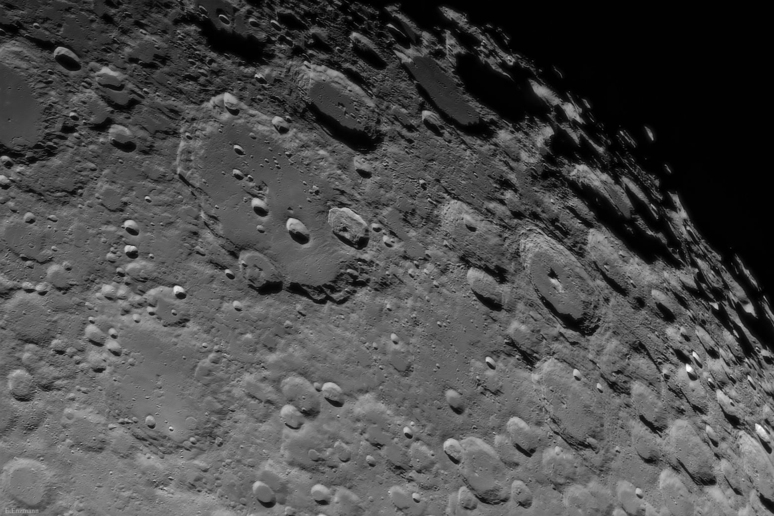 Am 20. März 2024 stand der Mond recht hoch und wie den Tag vorher gab es zeitweise gutes Seeing. Dabei ist dieses Bild entstanden. Aus einem 6-Minuten-Video mit über 42000 Einzelbildern wurde per Lucky Imaging AS4 die besten 20 Bilder gestäckt und mit RegiStax und PS final bearbeitet. Auch hier wurde das Teleskop mit nur 25% seiner Öffnung genutzt. Als Kamera diente eine ZWO-ASI-432MM.