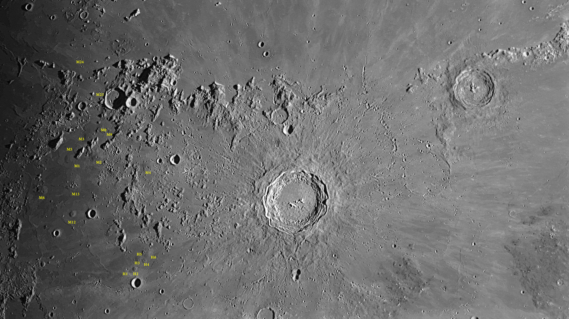 Das Gebiet um Krater Kopernikus mit Milichius-Hortensius-Domen. Es handelt sich dabei um Mondvulkane.