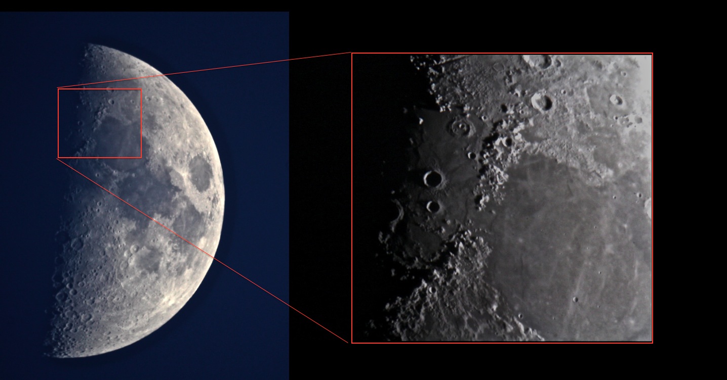 Das Bild ist eine Collage. Das rechte Bild wurde mit 1250 mm aufgenommen und das linke mit 1800 mm und zweifach-Barlowlinse.