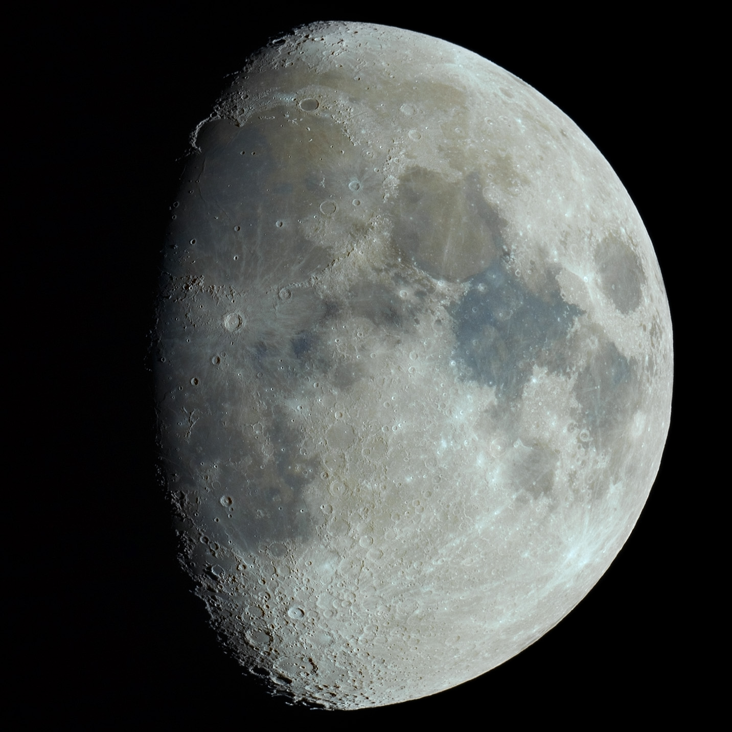 Am 25.3.2010 gab es für mich endlich mal wieder die Gelegenheit, ein paar Aufnahmen des hoch stehenden Mondes zu machen. Die Luft war relativ ruhig an diesem Abend. Bei der Bearbeitung habe ich versucht, die sonst recht harten Kontraste etwas zu harmonisieren und die Farben des Mondes dezent hervorzuheben.