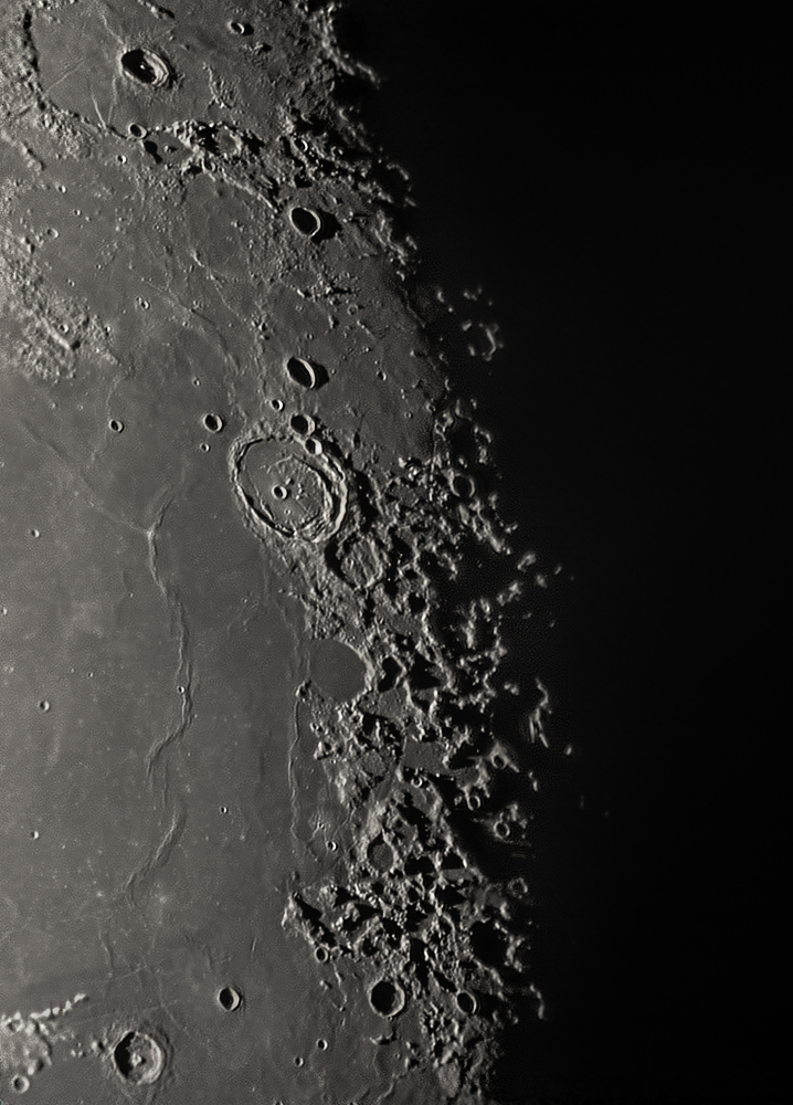 Eine meiner Lieblingsgegenden in sehr effektvoller Beleuchtung. In der Mitte der Krater Posidonius. Links davon schlängelt sich Smirnovs Schlange nach unten durchs Mare Serenitatis in Richtung Krater Plinius. Oben links ist gerade noch die Spitze in der Mitte von Lacus Mortis beleuchtet.