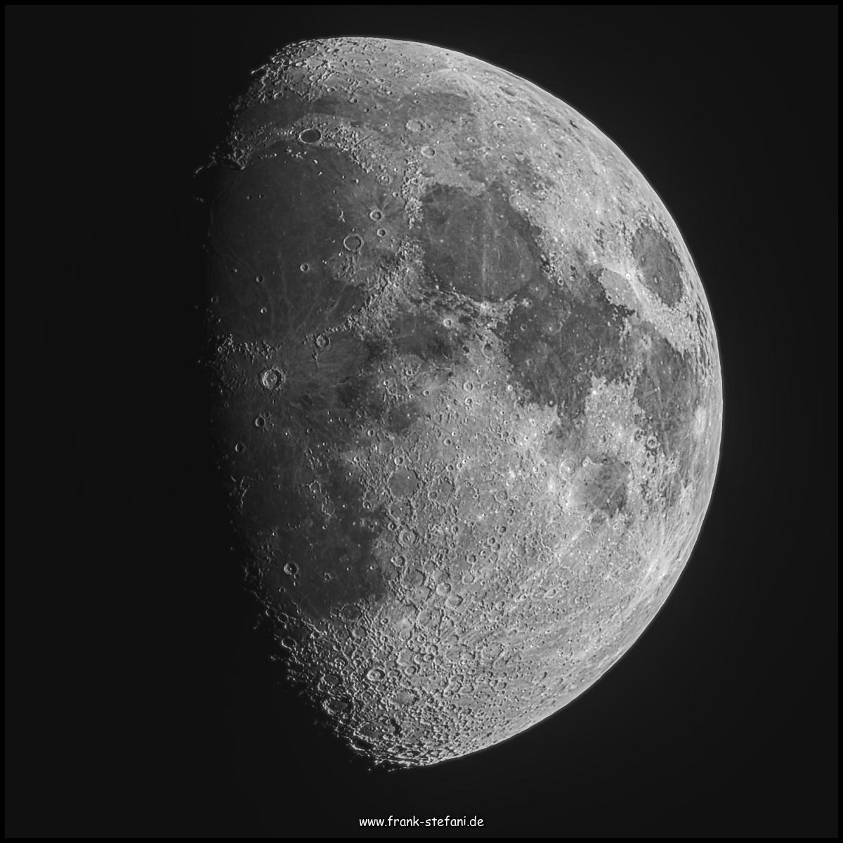 Es scheint so, dass es hier überhaupt keinen klaren Himmel mehr gibt: Tag und Nacht Schleierwolken, viel Dunst und Feuchtigkeit ... und dann natürlich auch die dicken Grauen .... Quellwolken, Schauer. So war ich vorhin äußerst überrascht, als der zunehmende Mond in voller Pracht vom Wetterstein-Gebirge herüber genau in mein Bürofenster strahlte. In einer Ruckzuck-Blitzaktion habe ich schnell alles im Büro (!) aufgebaut und, weil der Mond gleich wieder hinter den Birken verschwinden würde, einfach durch's offene Fenster fotografiert. Da mir keine Zeit für die Polausrichtung blieb, hatte ich ziemliche Mühe, den Mond (ohne Sucher) auf den Sensor der ASI533MC zu kriegen und konnte die Montierung nur als Stativ zu nutzen. Scharfstellen war auch suboptimal, weil ich mangels laufender Nachführung nur den zitternd durchs Bild wandernden Mond vor Augen hatte. Im Ergebnis ist die Schärfe daher etwas grob, weil vermutlich »knapp daneben«. Deshalb habe ich später grenzwertig stark nachgeschärft. Immerhin: Nach langer Zeit mal wieder ein Mond!