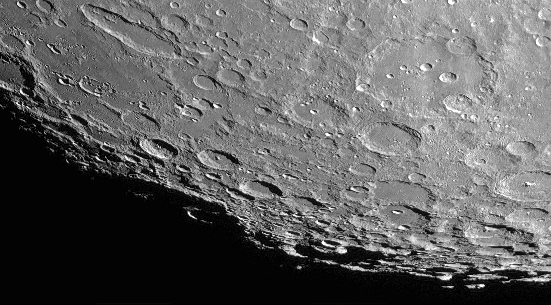 Am auffälligsten auf diesem Bild ist der langgestreckte Krater Schiller (200 x 80 km). Ganz im Süden deutet sich der grösste Mondkrater der Vorderseite an: Bailly (300 km). Auch Clavius macht wieder seine Aufwartung.