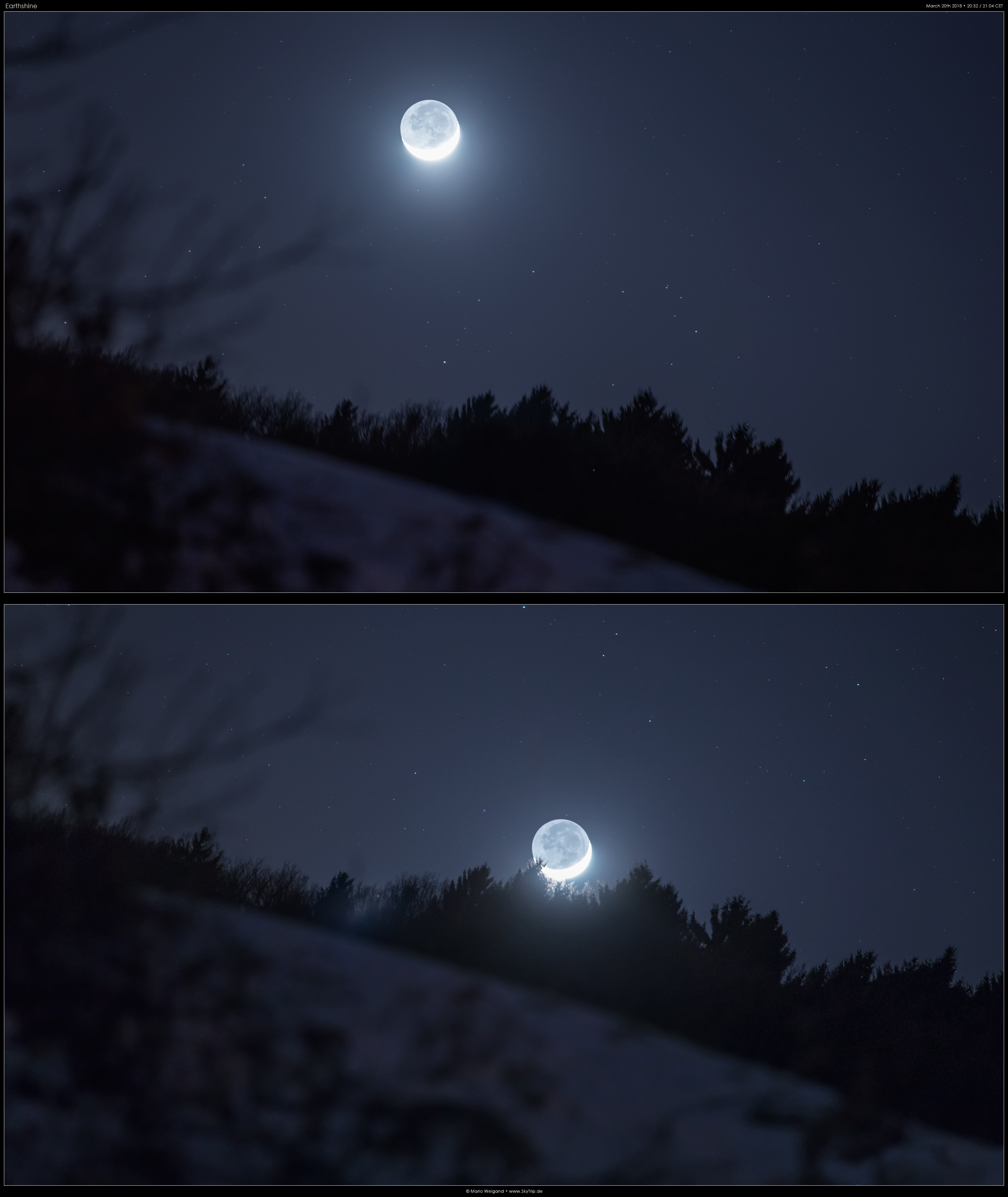 Eine Foto-Session am 20. März 2018 begann mit dem jungen Mond tief am Westhimmel. Die Luft war relativ klar und der Erschein hob sich kontrastreich vom Himmel ab. Der Mond stand an diesem Abend im Sternbild Wahlfisch (Cetus) zwischen den beiden Sternen μ Cet und ξ Cet in einem schönen Sternfeld. Als der Mond den (lokalen) Horizont mit Bäumen auf einem Hügel "berührte", wurde sein Licht an den Zweigen gestreut. Der eigentliche Monduntergang erfolgte erst fast eine Stunde später. http://www.skytrip.de/monvid406.htm