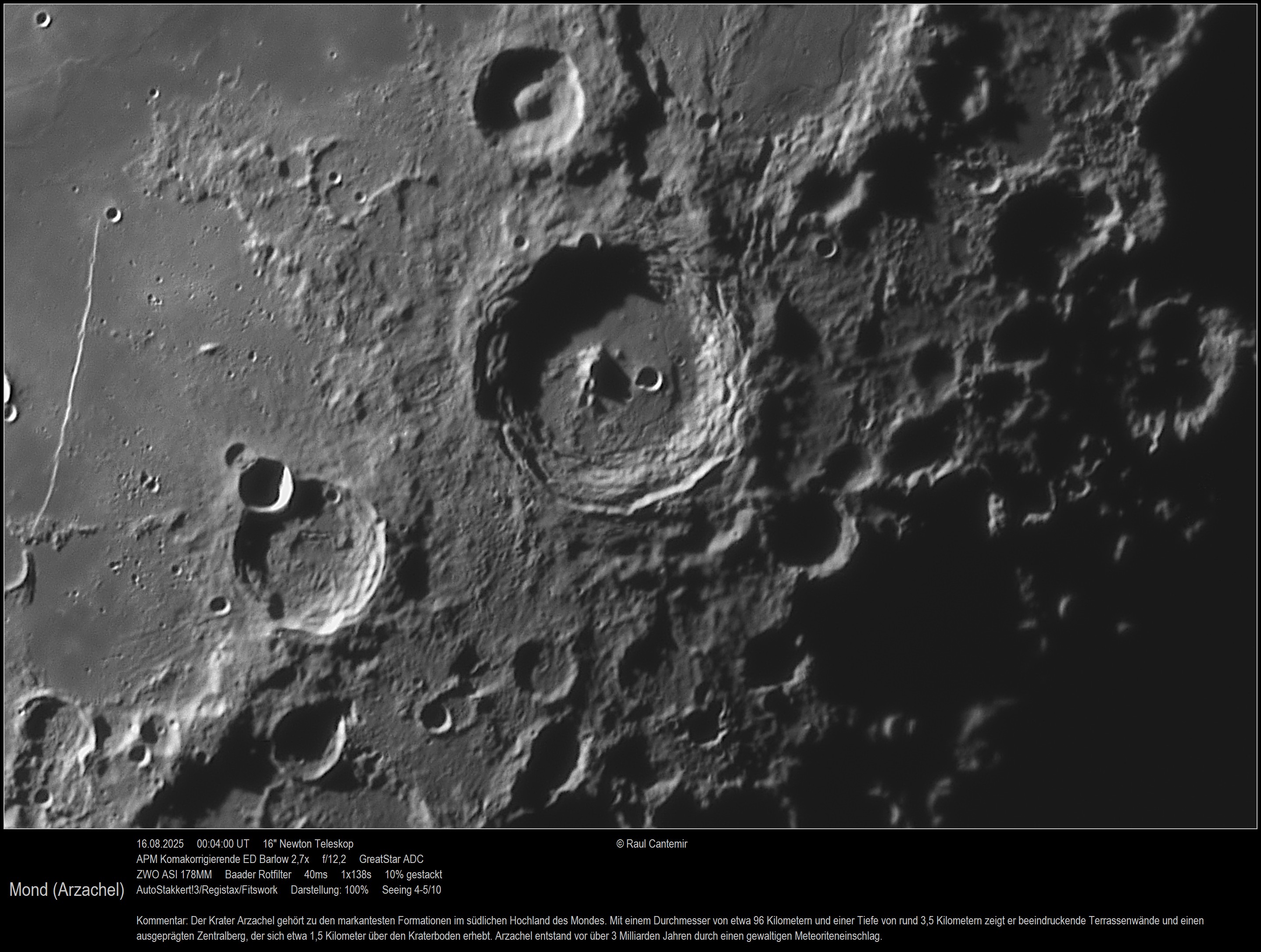 Der Krater Arzachel gehört zu den markantesten Formationen im südlichen Hochland des Mondes. Mit einem Durchmesser von etwa 96 Kilometern und einer Tiefe von rund 3,5 Kilometern zeigt er beeindruckende Terrassenwände und einen ausgeprägten Zentralberg, der sich etwa 1,5 Kilometer über den Kraterboden erhebt. Arzachel entstand vor über 3 Milliarden Jahren durch einen gewaltigen Meteoriteneischlag. Schön zu sehen sind hier die Schattenwürfe.