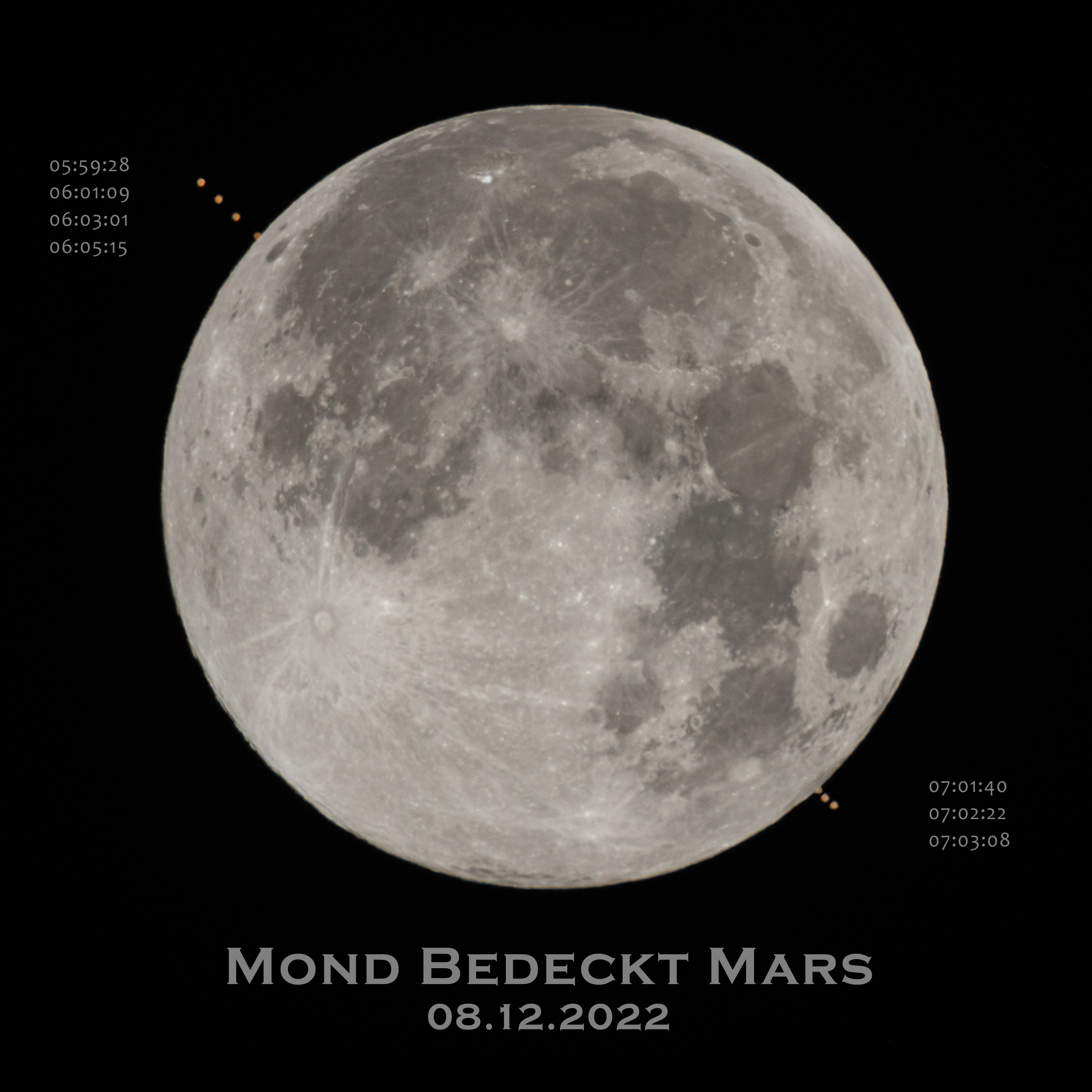 Trotz schlechter Wettervorhersage war es heute früh bei uns klar. Ich habe die Bedeckung von Mars durch den Mond mit einem verrückten Setup auf der Dachterrasse fotografiert: EOS R5 mit dem Sigma 150-600 bei 600 mm plus 2-fach Konverter plus 1,4-fach Konverter. Macht 1680 mm Brennweite. Das Ganze auf dem Fotostativ (ohne Nachführung), immer wieder nachgestellt und darauf gehofft, dass der Bildstabilisator den Rest erledigt. Durch die Schornsteine der umliegenden Häuser kamen immer wieder Schlieren, aber irgendwie bin ich doch zufrieden. Collage aus sieben Aufnahmen.