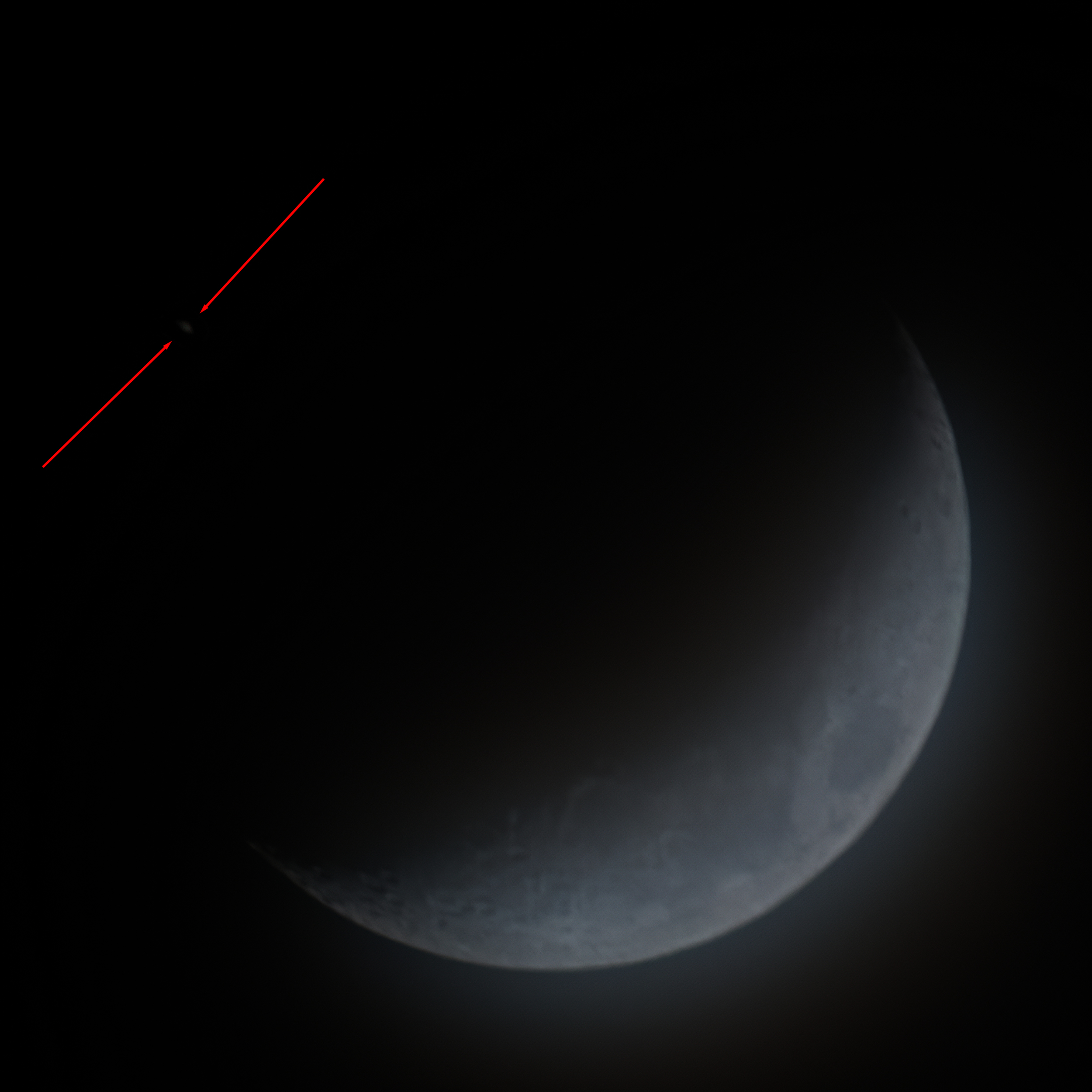 Zum zweiten Mal in relativ kurzer Zeit bedeckte der Mond den Ringplaneten. Leider gab es dichten Hochnebel, das »Mondkipferl« gerade mal erkennbar, Saturn mit bloßen Augen gar nicht. Trotzdem am heimischen Balkon die DSLM mit Teleobjektiv und 840 mm Brennweite, 95 mm Öffnung aufgestellt und Bilder im Intervall angefertigt. Ein zarter, ovaler Schatten vom Saturn war dann auf den Photos erkennbar. Bild anbei unmittelbar vor der Bedeckung.