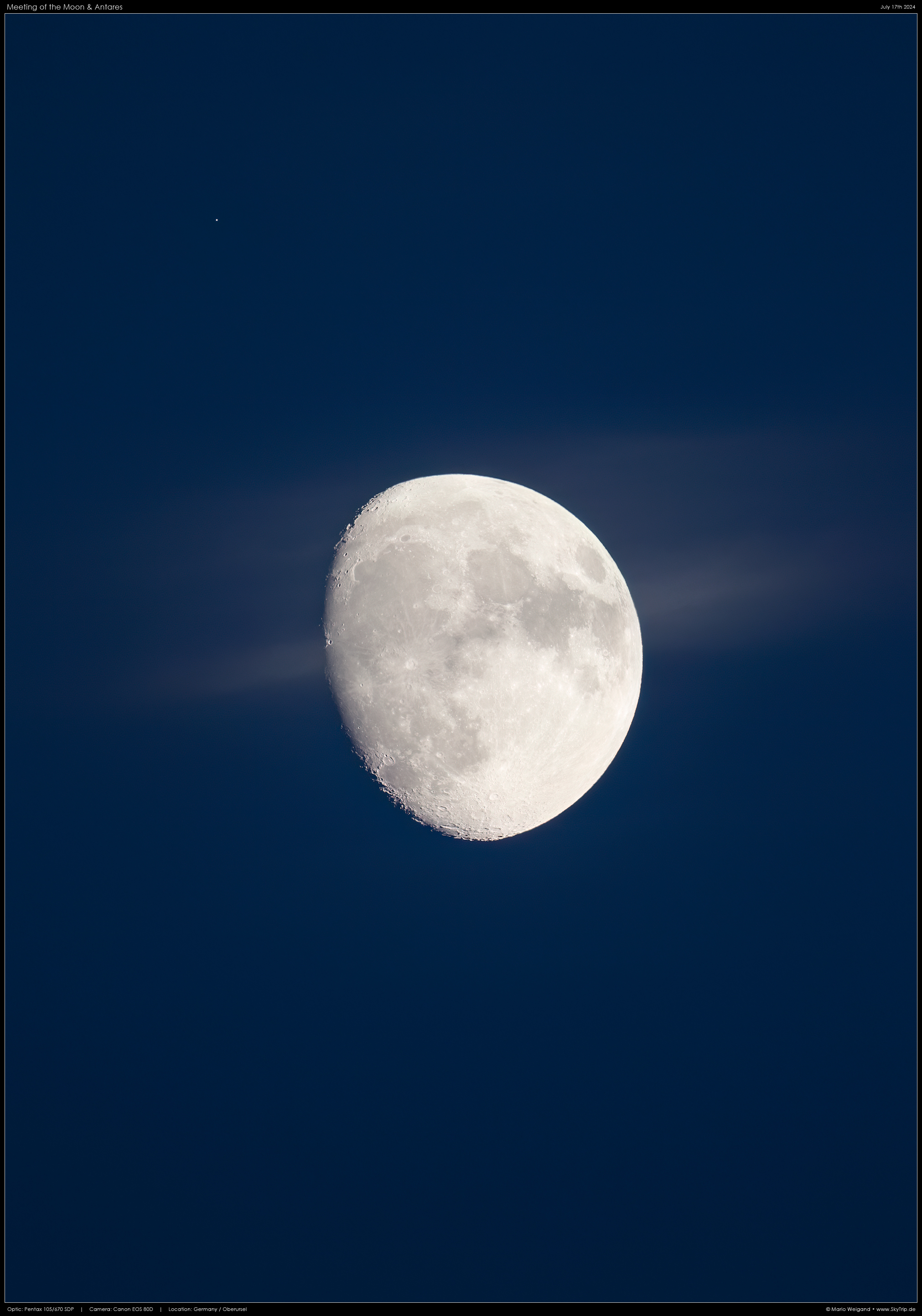 Am 17. Juli wanderte der zunehmende Mond am hellen Roten Riesen Antares vorbei. Dieses Bild zeigt die Konjunktion während der Abenddämmerung.