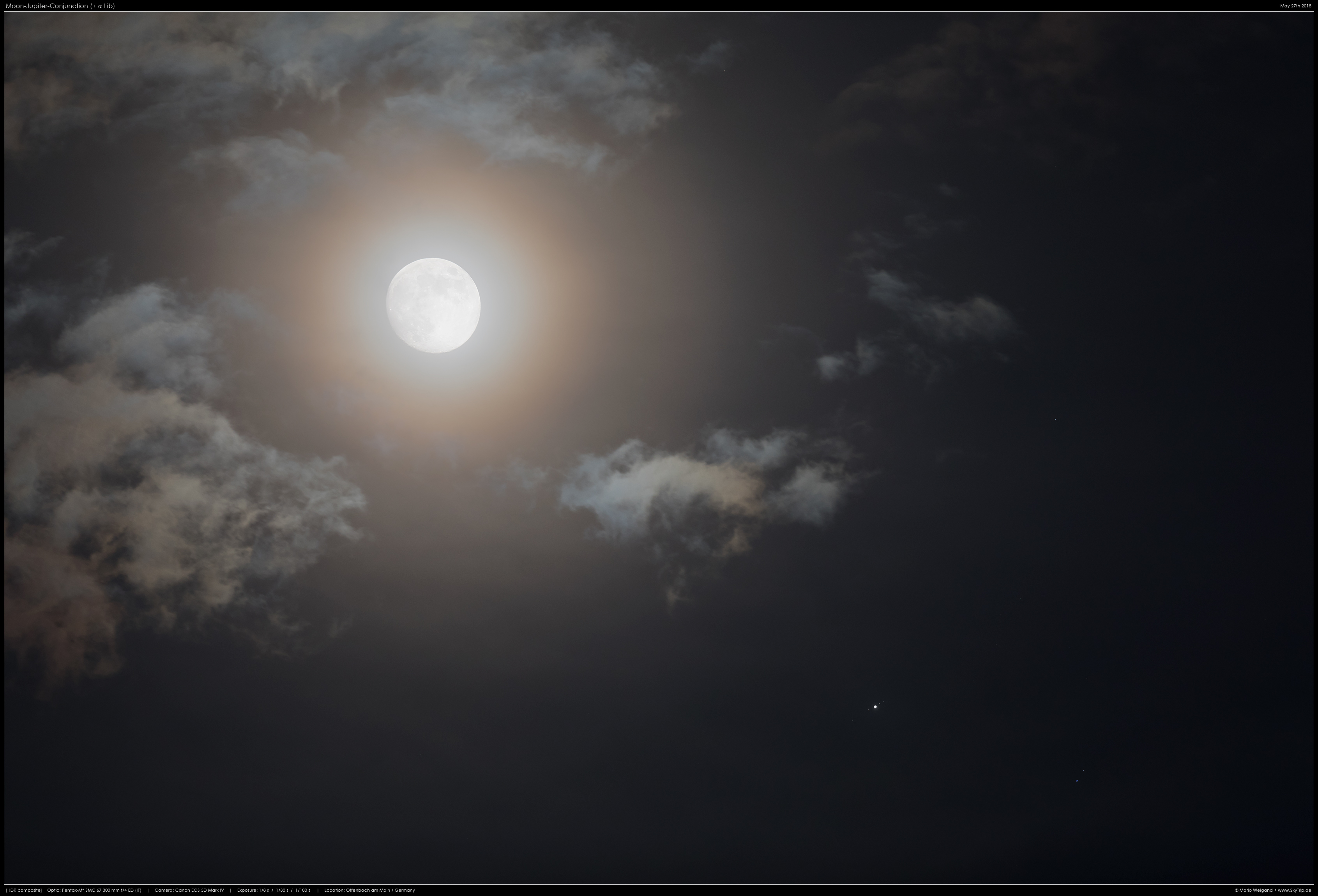 Am 27. Mai 2018 begegnete der fast volle Mond dem Riesenplanet Jupiter. Der Winkelabstand betrug zur Zeit der Aufnahme etwas mehr als drei Grad. Die Konjunktion war trotz einiger Bewölkung in den Abendstunden und Gewittern in der Umgebung schön zu beobachten. Gegen Ende der Dämmerung waren auch die Jupitermonde gut zu sehen. Und eine zweite schöne Konjunktion fiel auf: Unten rechts im Bild ist α Librae ("Zuben Elgenubi") zu sehen.