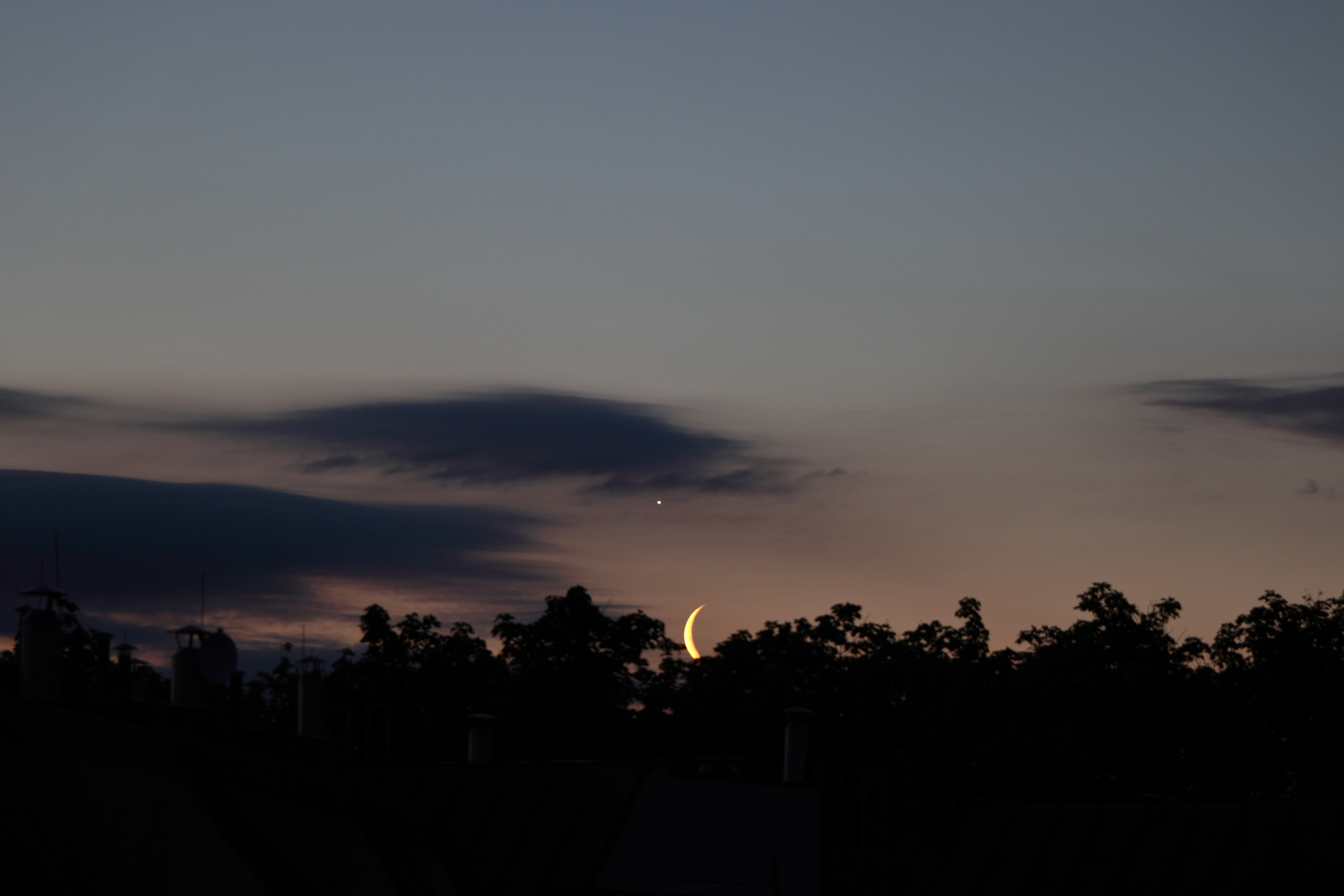 27. Mai 2022: Mit freiem Auge besonders eindrucksvoll war der Mond beim Morgenplaneten Venus zu sehen. 4:08 Uhr MESZ: Aufgang des Mondes über dem Landschaftshorizont.