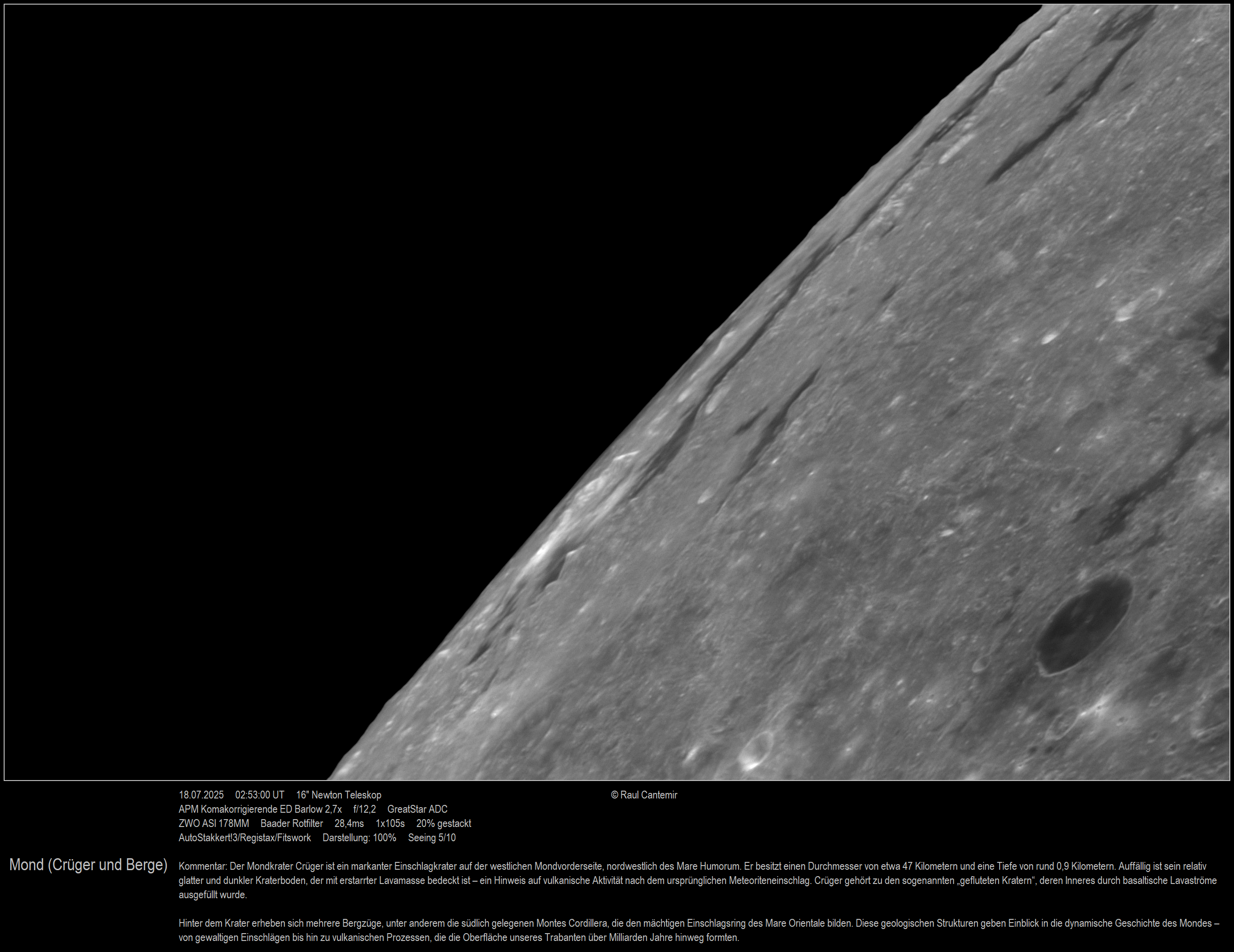 Der Mondkrater Crüger ist ein markanter Einschlagkrater auf der westlichen Mondvorderseite, nordwestlich des Mare Humorum. Er besitzt einen Durchmesser von etwa 47 Kilometern und eine Tiefe von rund 0,9 Kilometern. Auffällig ist sein relativ glatter und dunkler Kraterboden, der mit erstarrter Lavamasse bedeckt ist – ein Hinweis auf vulkanische Aktivität nach dem ursprünglichen Meteoriteneinschlag. Crüger gehört zu den so genannten gefluteten Kratern, deren Inneres durch basaltische Lavaströme ausgefüllt wurde. Hinter dem Krater erheben sich mehrere Bergzüge, unter anderem die südlich gelegenen Montes Cordillera, die den mächtigen Einschlagsring des Mare Orientale bilden. Diese geologischen Strukturen geben Einblick in die dynamische Geschichte des Mondes – von gewaltigen Einschlägen bis hin zu vulkanischen Prozessen, die die Oberfläche unseres Trabanten über Milliarden Jahre hinweg formten. Für dieses Bild konnte ich aufgrund des Seeings und der Transparenz mein 16-Zoll-Carbon-Gitterohr-Newton-Teleskop nur zu rrund 50% ausreizen. Dennoch ist der Blickwinkel auf die Berge hinter dem Krater Crüger sehr beeindruckend.