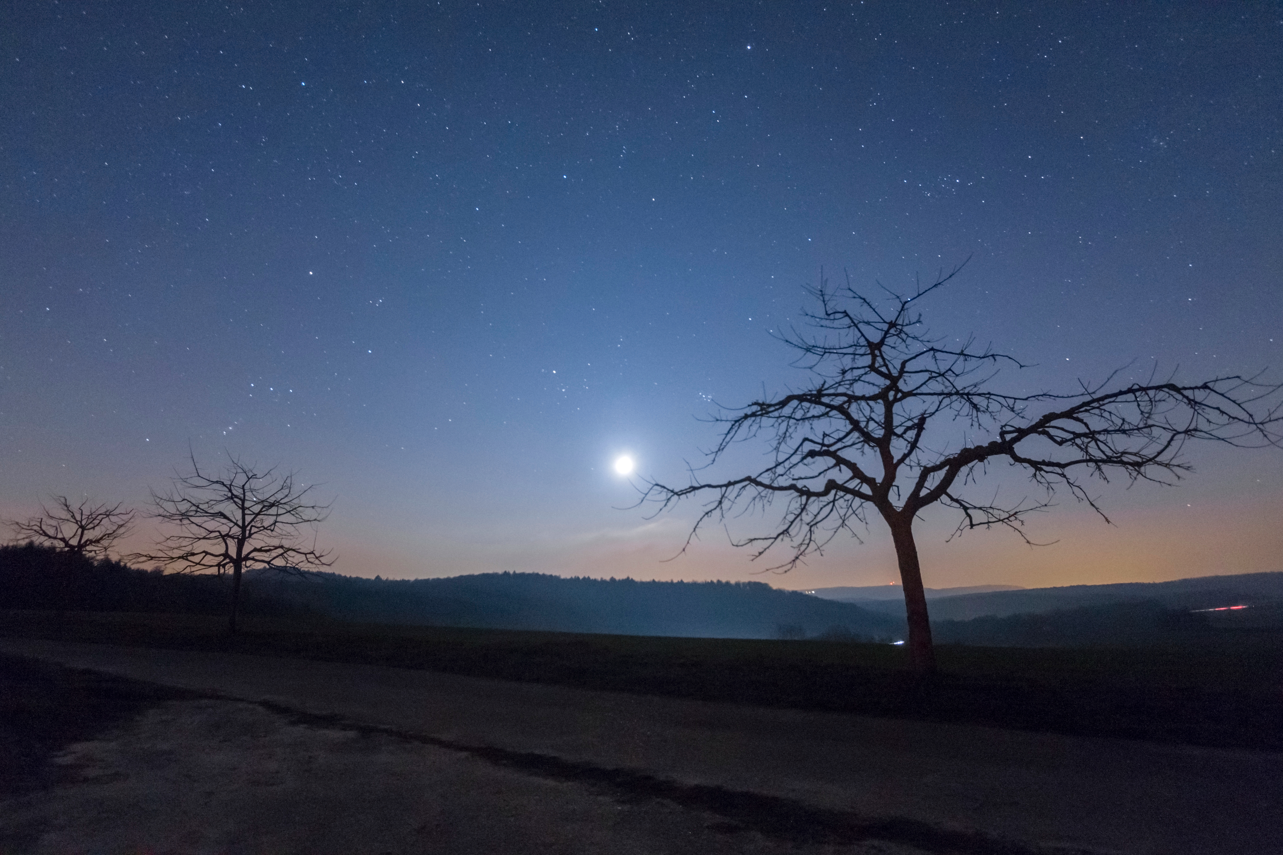 Für Deepsky war der Mond zu hell, aber die Sternbilder kamen dennoch gut raus und die Natriumdampfbeleuchtung der umliegenden Ortschaften lieferten den farblichen Hintergrund.