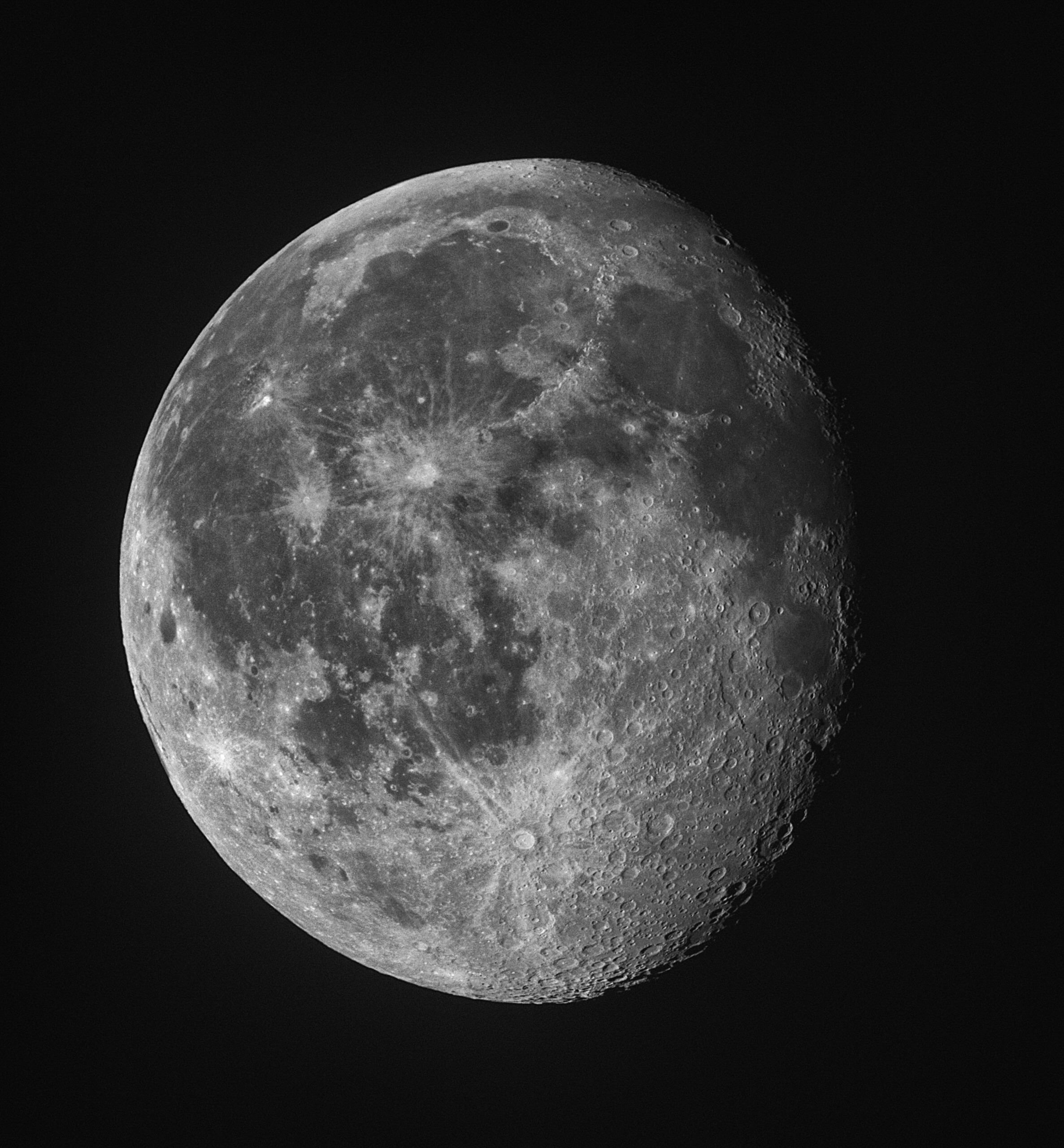 Am Abend des 22. Dezember 2021 war die Libration wieder deutlich: links (Himmelsosten, Mondwesten) konnten wir eine Spur des Ostmeers (Mare Orientale) mit den Herbst- und Frühlingsseen (Lacus Autumni, Lacus Veris) erhaschen. Auch der gebirgige Mondsüden (unten) war uns zugewandt.