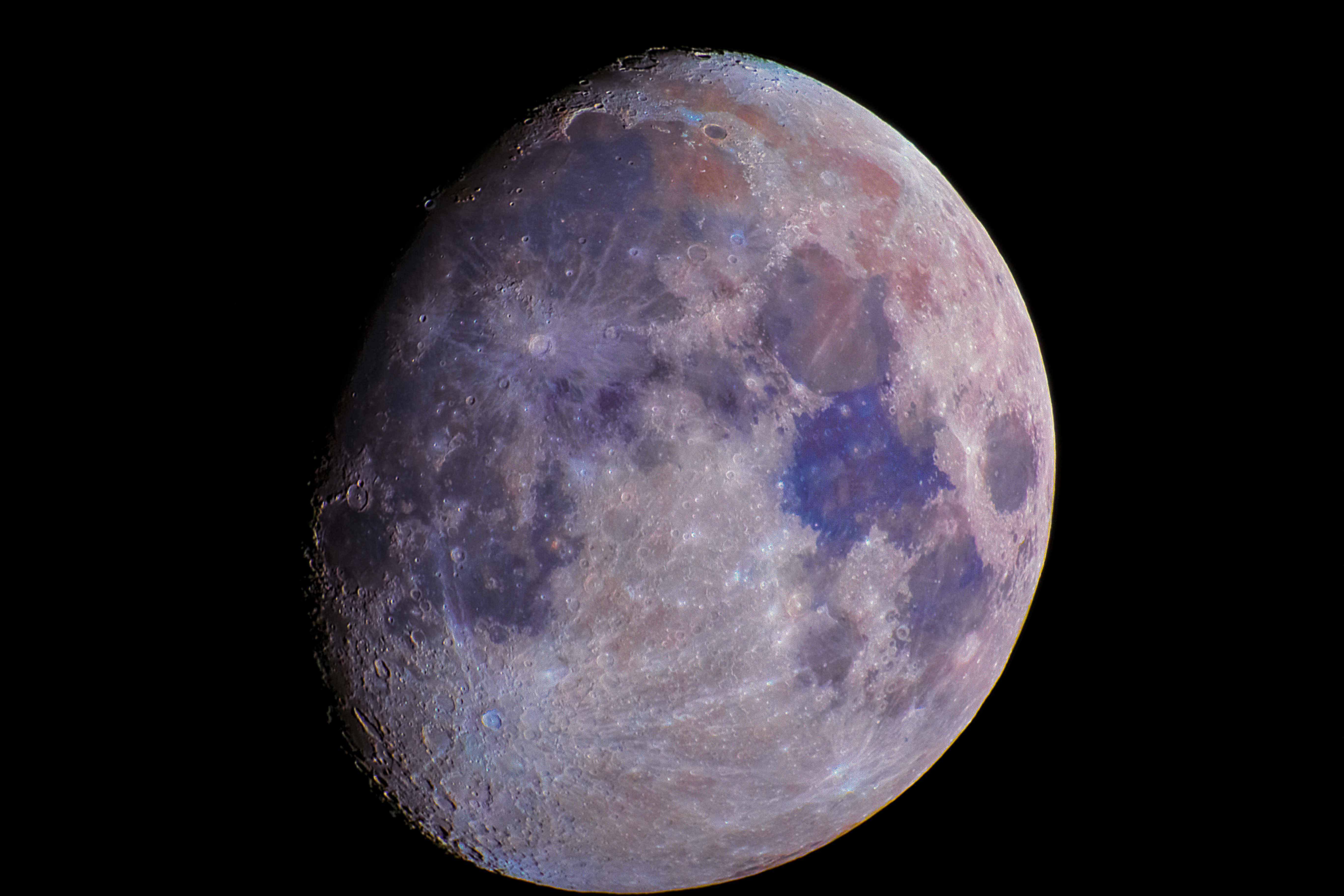 Eigentlich wollte ich am 18. März 2019 einen ISS-Transit fotografieren, leider schoben sich pünktlich zum Ereignis die Wolken vor den Mond. Damit am Ende nicht alles umsonst war, habe ich die (kurz davor) gewonnenen Bilder gestackt und kontrastverstärkt. Dadurch wird die unterschiedliche geologische Zusammensetzung des Mondes sichtbar.