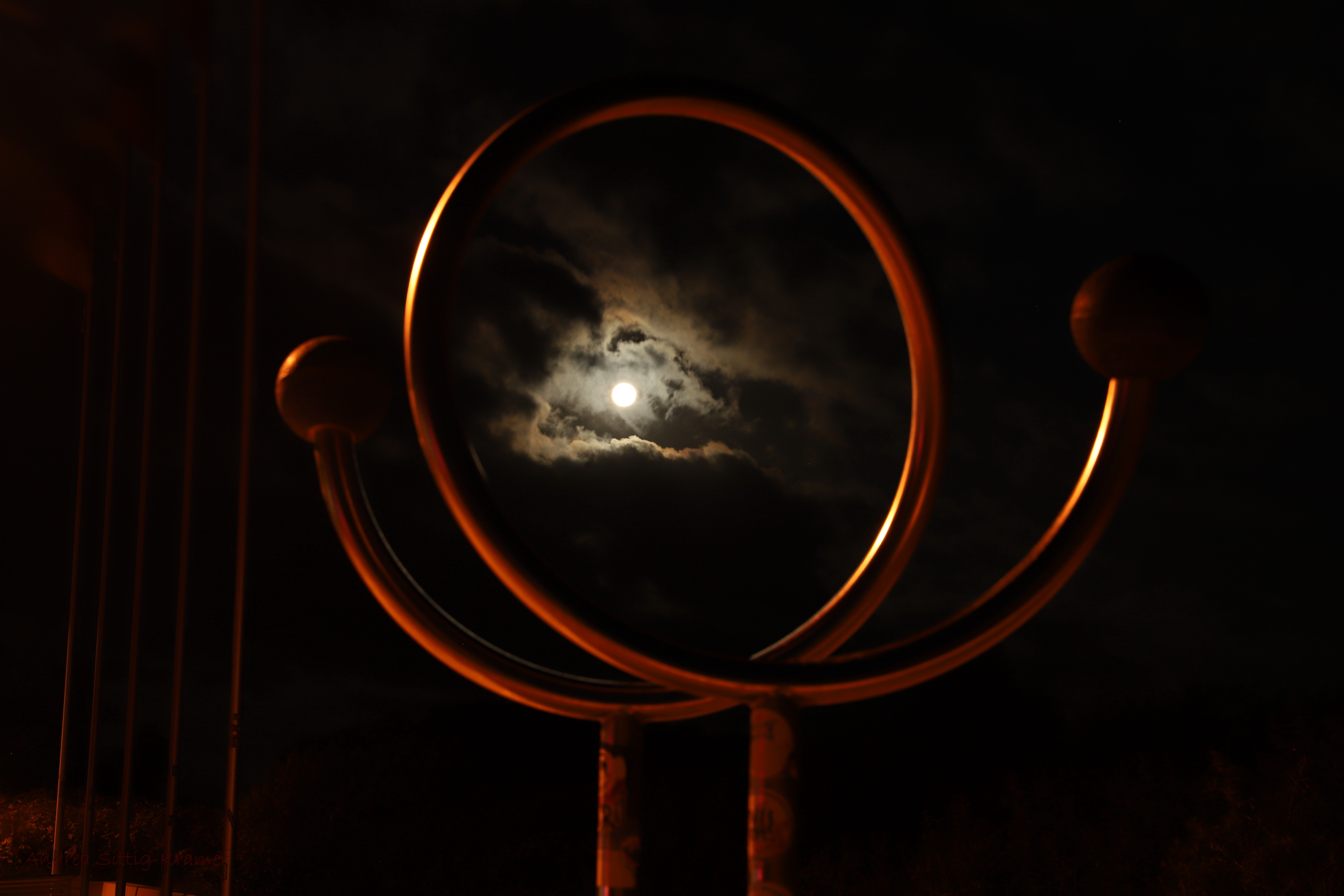 Am Morgen des 14. Oktober 2019, einen Tag nach Vollmond, suchte ich im Ostseebad Warnemünde nach interessanten Fotomotiven. Ich entdeckte an der Strandpromenade ein Edelstahl-Kunstwerk. So entstand durch geschickte Positionierung der Kamera der Mond mit Halo in der Schlaufe!