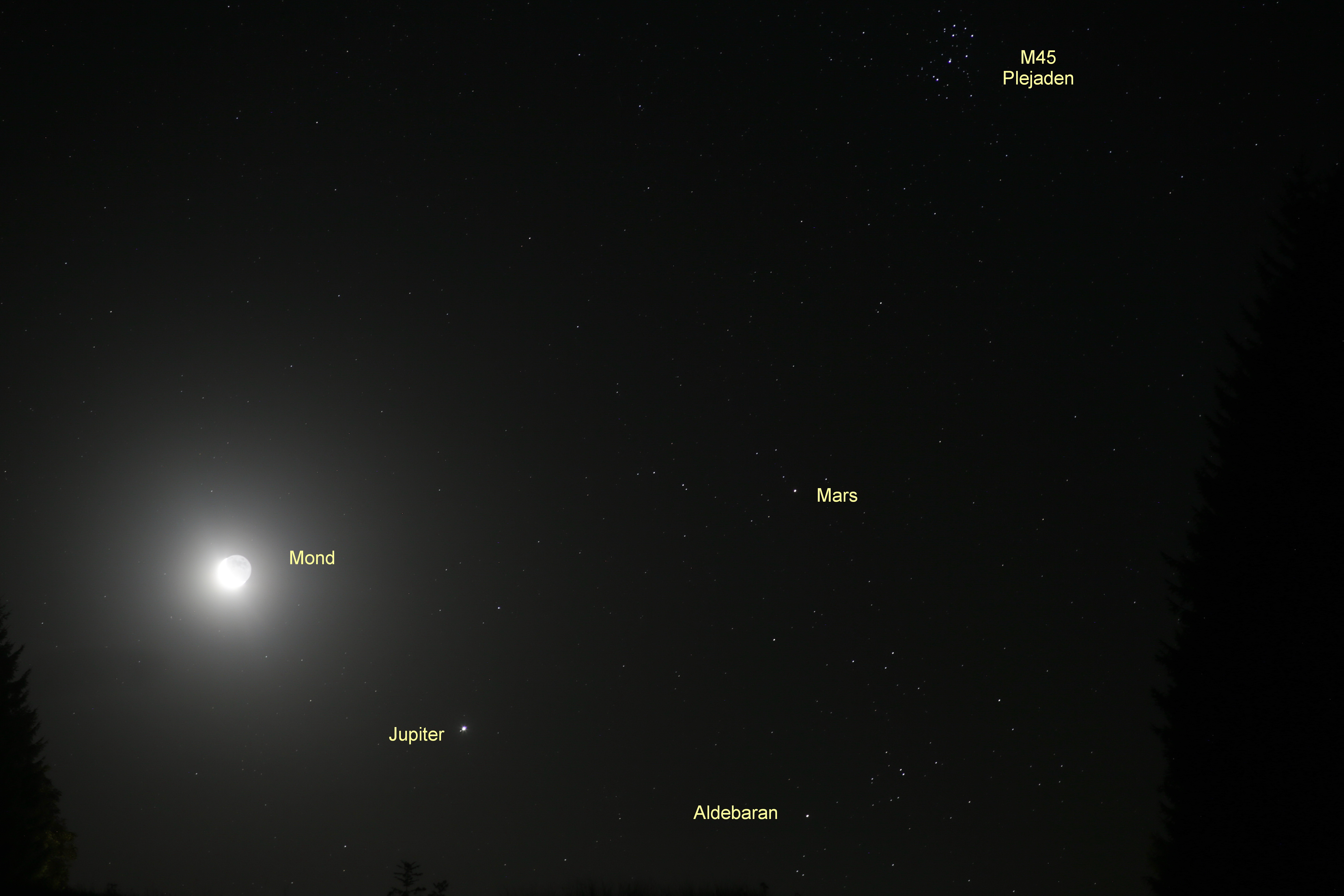 Leserbilder Astronomie: Mond-Jupiter-Mars-Plejaden