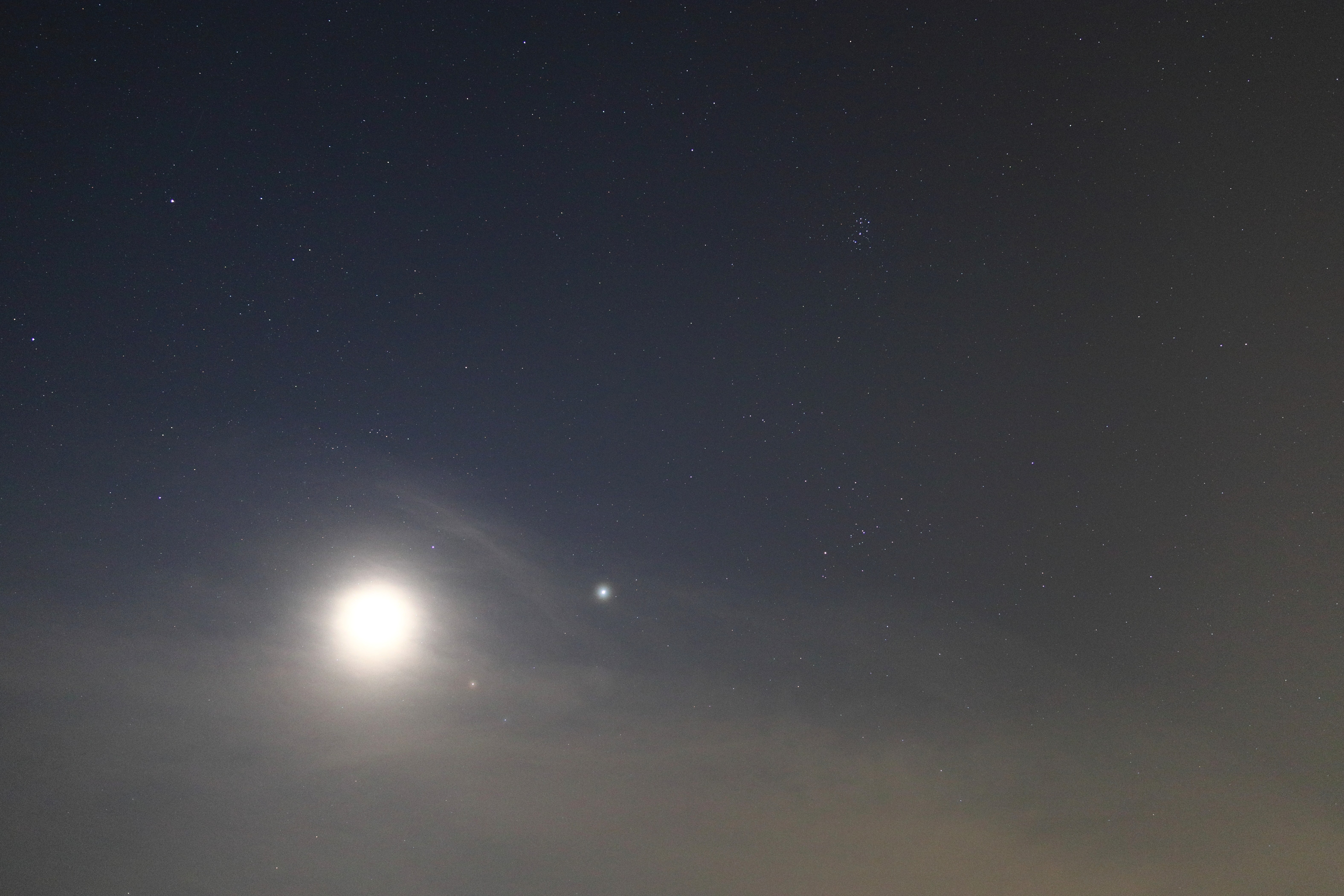 Heute haben sich Mond, Jupiter und Mars auch bei mir aus dem Bodendunst/Morgennebel gekämpft. Uranus westlich der Pleiaden ist am Foto bzw. im Fernglas erkennbar