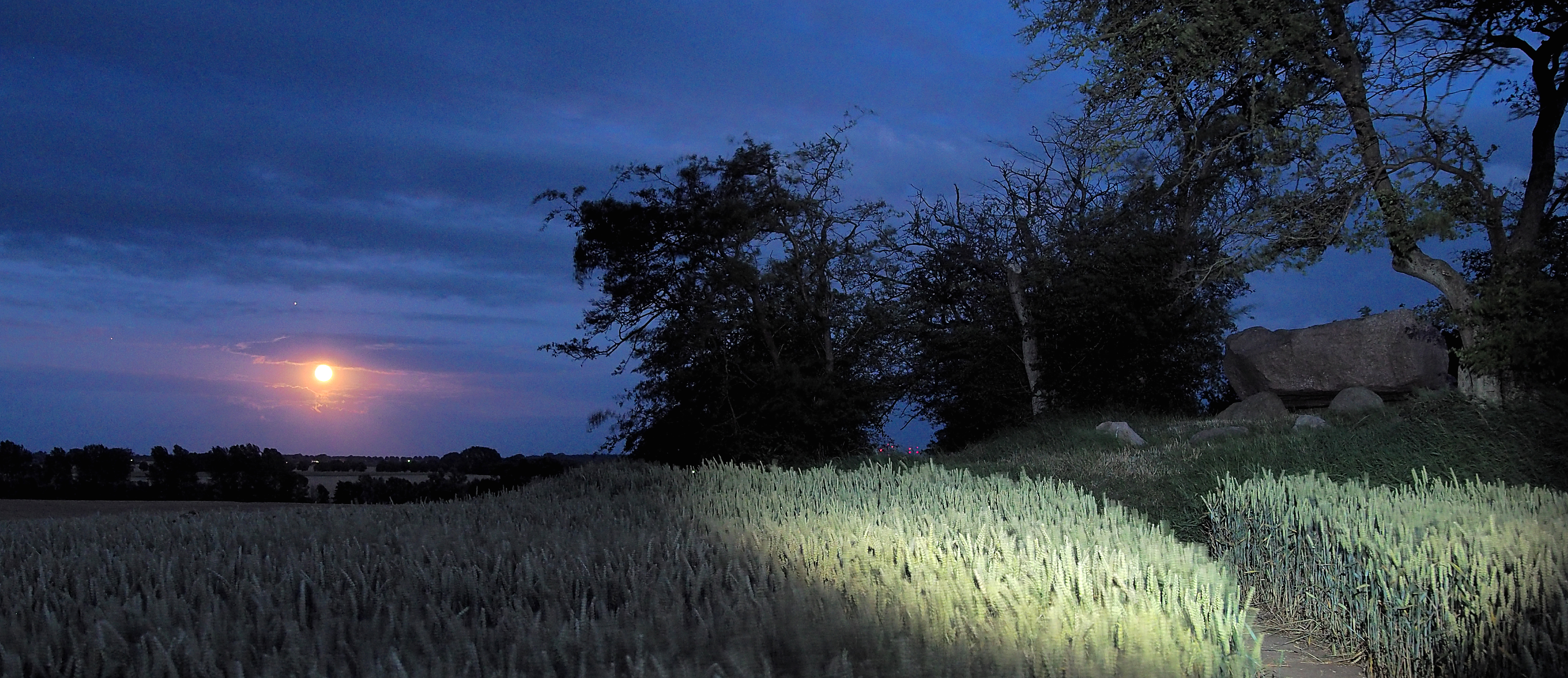 Diese schöne Konstellation von Vollmond, Jupiter und Saturn konnte ich an meinem ersten Urlaubstag (genauer Urlaubsnacht …) an der Ostsee in Rerik beobachten. Ich wählte einen besonderen Beobachtungsplatz aus, rechts im Bild sieht man ein Großsteingrab der Jungsteinzeit (Großdolmen), diesen habe ich ein wenig mit einer hellen Taschenlampe beleuchtet. Dieser Großdolmen ist jetzt etwa 5000 Jahre alt. Die Lichtstimmung war schon sehr beeindruckend.