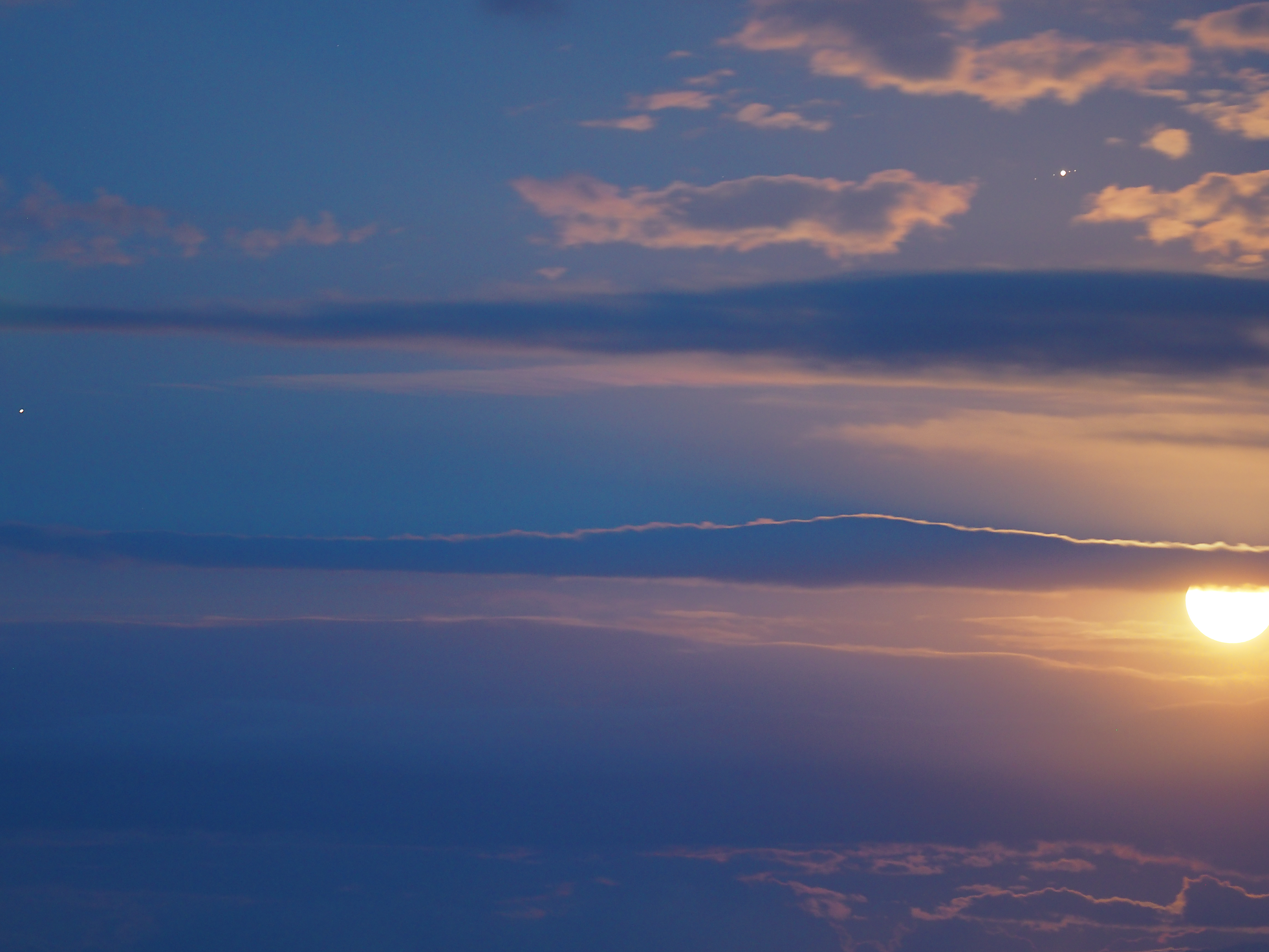Eine schöne Lichtstimmung dank Wolken. Zum Glück passten alle drei noch auf das Bild, der Sensor ist ja etwas kleiner als APS und da wird aus dem 135-mm-Tele schon ein Bildwinkel wie 270 mm an KB. Schade zwar das der Mond überbelichtet ist, aber so ist der Planet Jupiter mit seinen vier Monden zu sehen. Von links nach rechtes sieht man Kallisto, Europa, Jupiter, Io und Ganymed.