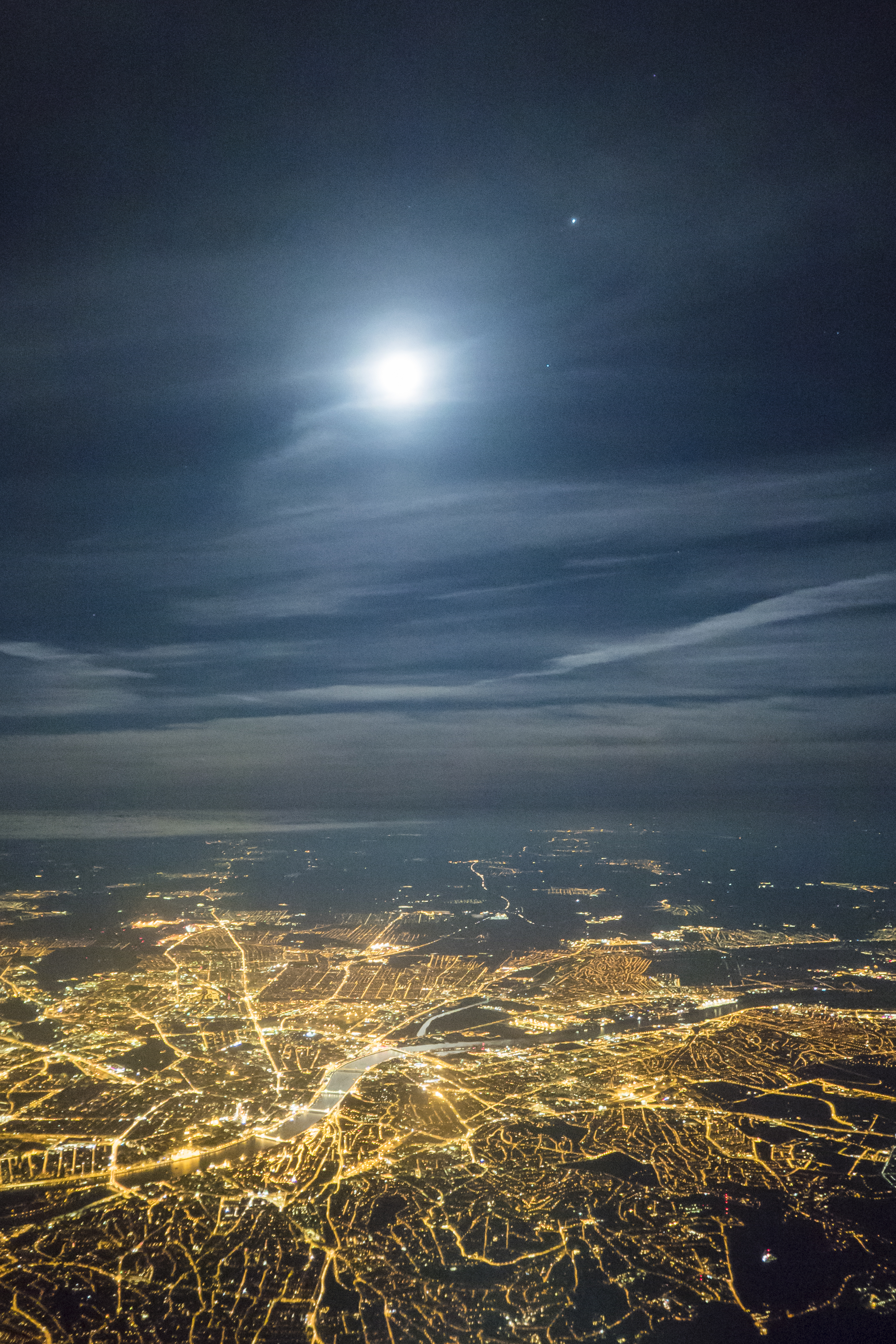 Kurz nach Vollmond und Jupiteropposition bildeten am 11. April 2017 Mond, Jupiter und Spica ein gleichschenkliges Dreieck am Himmel. Vom Cockpit eines Airbus A320 aus gesehen strahlen sie auf diesem Foto über Budapest (Ungarn). Der Mond erhellt dabei die Donau, die die zwei Stadtteile Buda und Pest trennt.