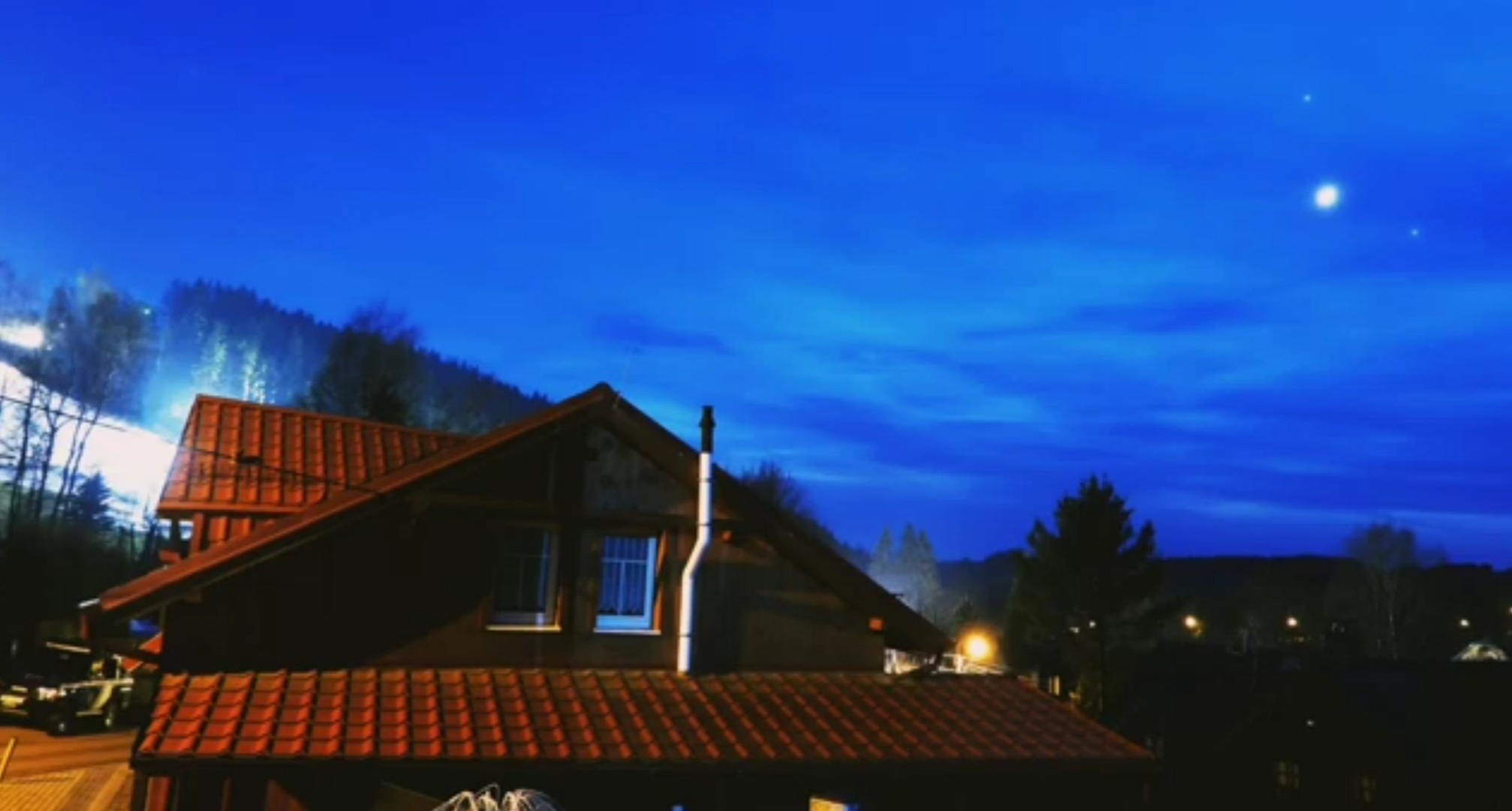 Der Mond (8,8%) stand zwischen Jupiter und Venus über dem Skigebiet Bublava in Tschechien. Zeitrafferfilm davon: https://www.youtube.com/watch?v=F5FrVYK4_-c