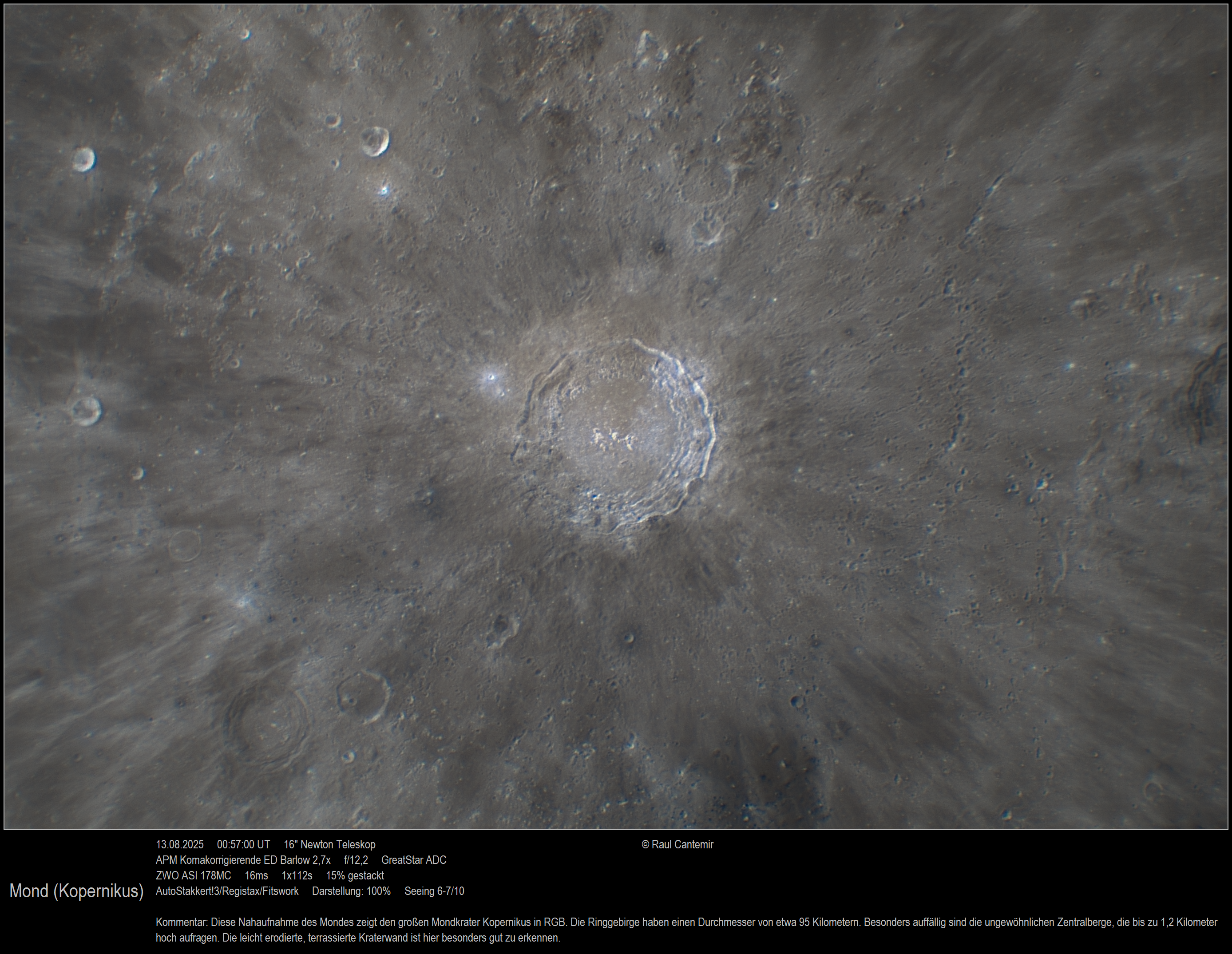 Diese Mondnahaufnahme mit Kopernikus in Farbe entstand während meines vierten Versuchs mit meinem neuen Teleskop. Die ursprüngliche Struktur stammt von DocTelescope. Ich habe das Teleskop vollständig zerlegt und mehrere Erweiterungen vorgenommen. Neben einer Pulverbeschichtung habe ich verschiedene Komponenten aus Carbonfaser und eloxiertem Aluminium ergänzt, um Leistung und Ästhetik zu verbessern. Das Seeing lag bei etwa 7 von 10. Diese extrem scharfe Nahaufnahme des Mondes zeigt den großen Mondkrater Kopernikus in RGB. Das Ringgebirge hat einen Durchmesser von etwa 95 Kilometern. Besonders auffällig sind die ungewöhnlichen Zentralberge, die bis zu 1,2 Kilometer hoch aufragen. Die leicht erodierte, terrassierte Kraterwand ist hier besonders gut zu erkennen.