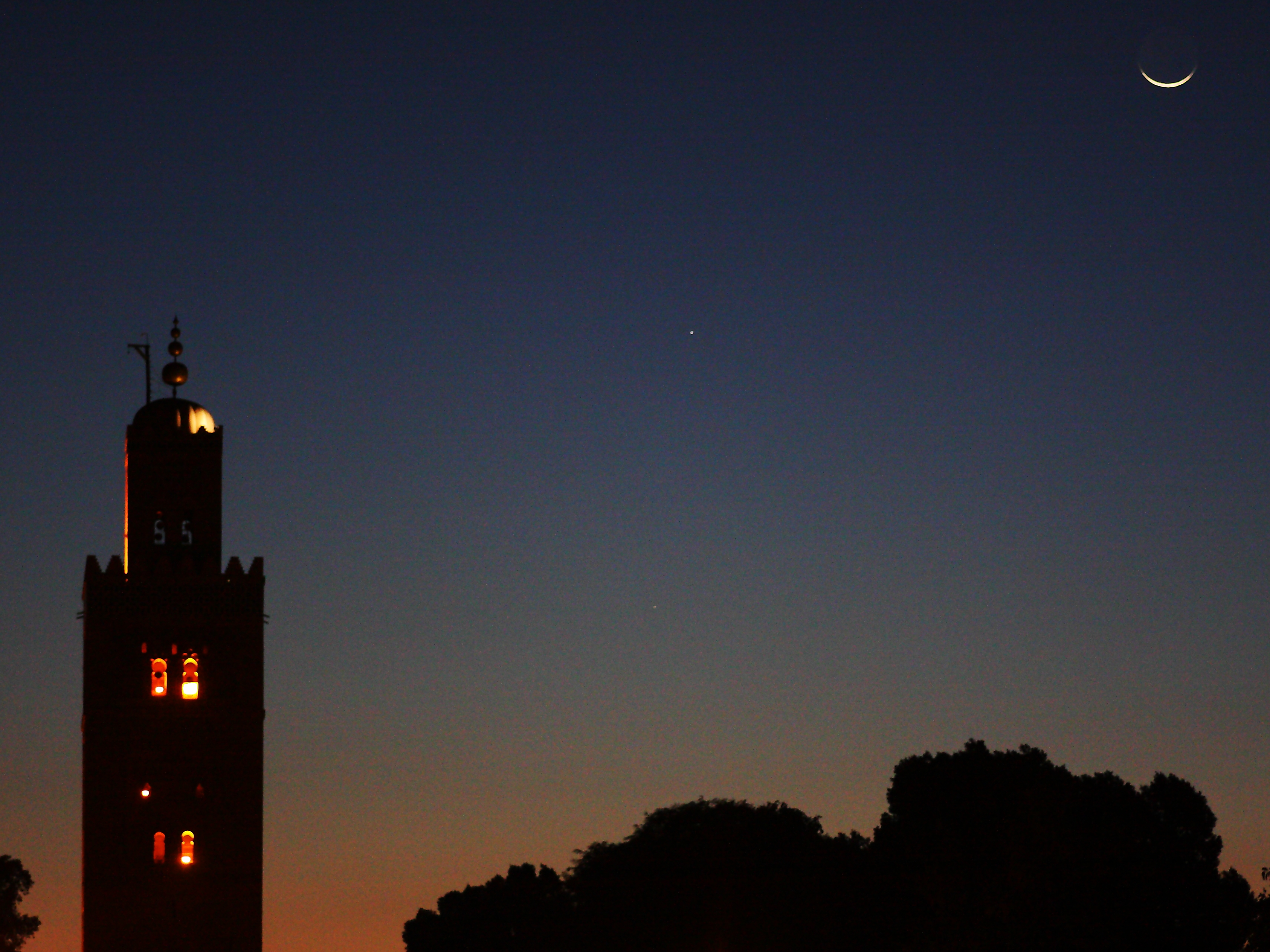 Blick von der Terrasse des Café de France über den Platz Djemaa el Fna zur Koutoubia-Moschee. Mit fortschreitender Dämmerung fiel der Blick auf die waagrecht liegende Mondsichel mit Erdschein neben der Moschee. "Schönes Motiv!", dachte ich. Dann bemerkte ich einen hellen Lichtpunkt und ich erinnerte mich, dass im Februar Merkur eine Abendsichtbarkeit hatte! Zu Hause kontrollierte ich die Konstellation auf dem iPad und sah, dass auch Mars auf dem Bild zu sehen sein müsste. Und tatsächlich, ich fand ihn links unter Merkur bei einer Horizonthöhe von unter 10°.