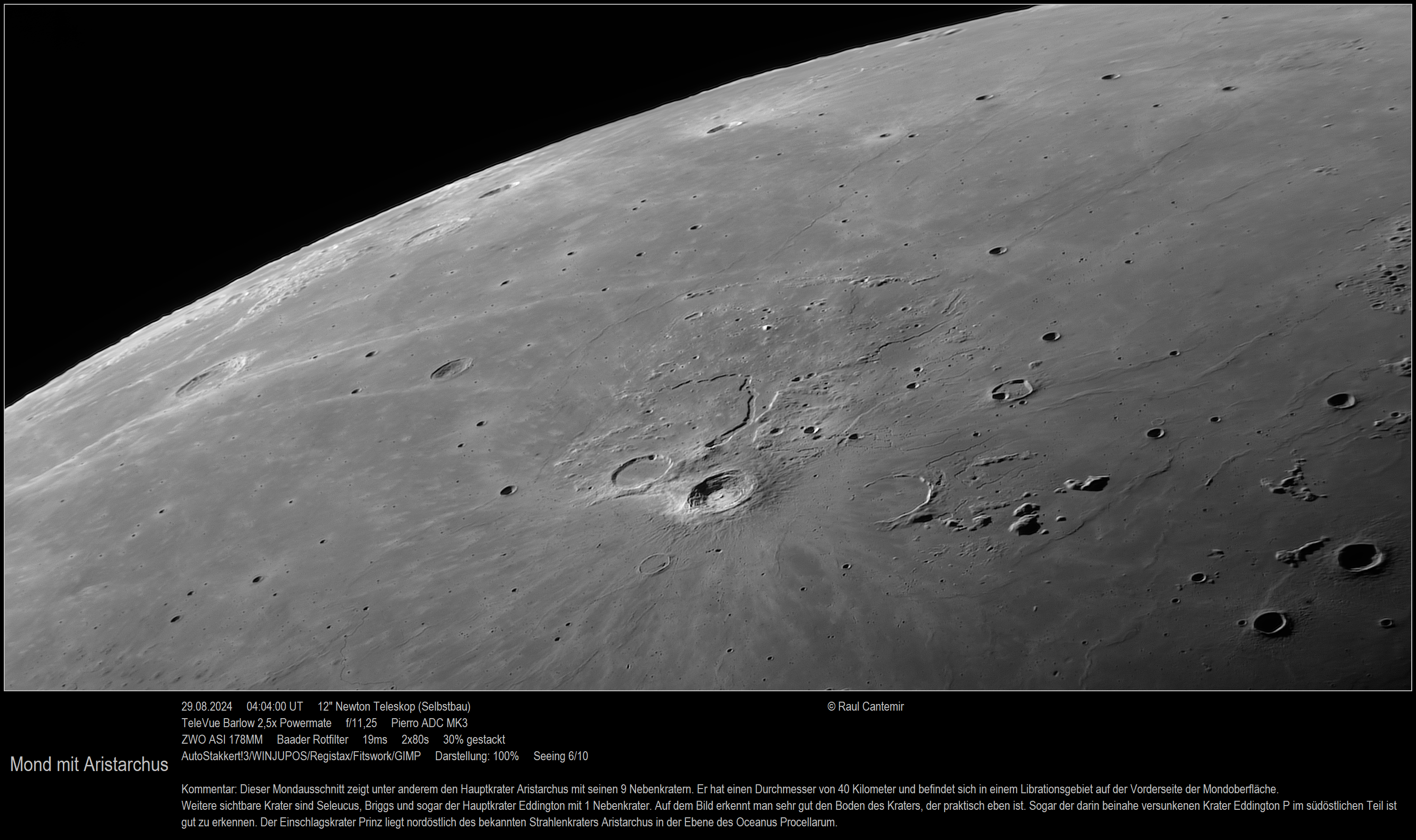 Dieser Mondausschnitt zeigt unter anderem den Hauptkrater Aristarchus mit seinen neun Nebenkratern. Er hat einen Durchmesser von 40 Kilometer und befindet sich in einem Librationsgebiet auf der Vorderseite der Mondoberfläche. Weitere sichtbare Krater sind Seleucus, Briggs und sogar der Hauptkrater Eddington mit einem Nebenkrater. Auf dem Bild erkennt man sehr gut den Boden des Kraters, der praktisch eben ist. Sogar der darin beinahe versunkenen Krater Eddington P im südöstlichen Teil ist gut zu erkennen. Der Einschlagskrater Prinz liegt nordöstlich des bekannten Strahlenkraters Aristarchus in der Ebene des Oceanus Procellarum.