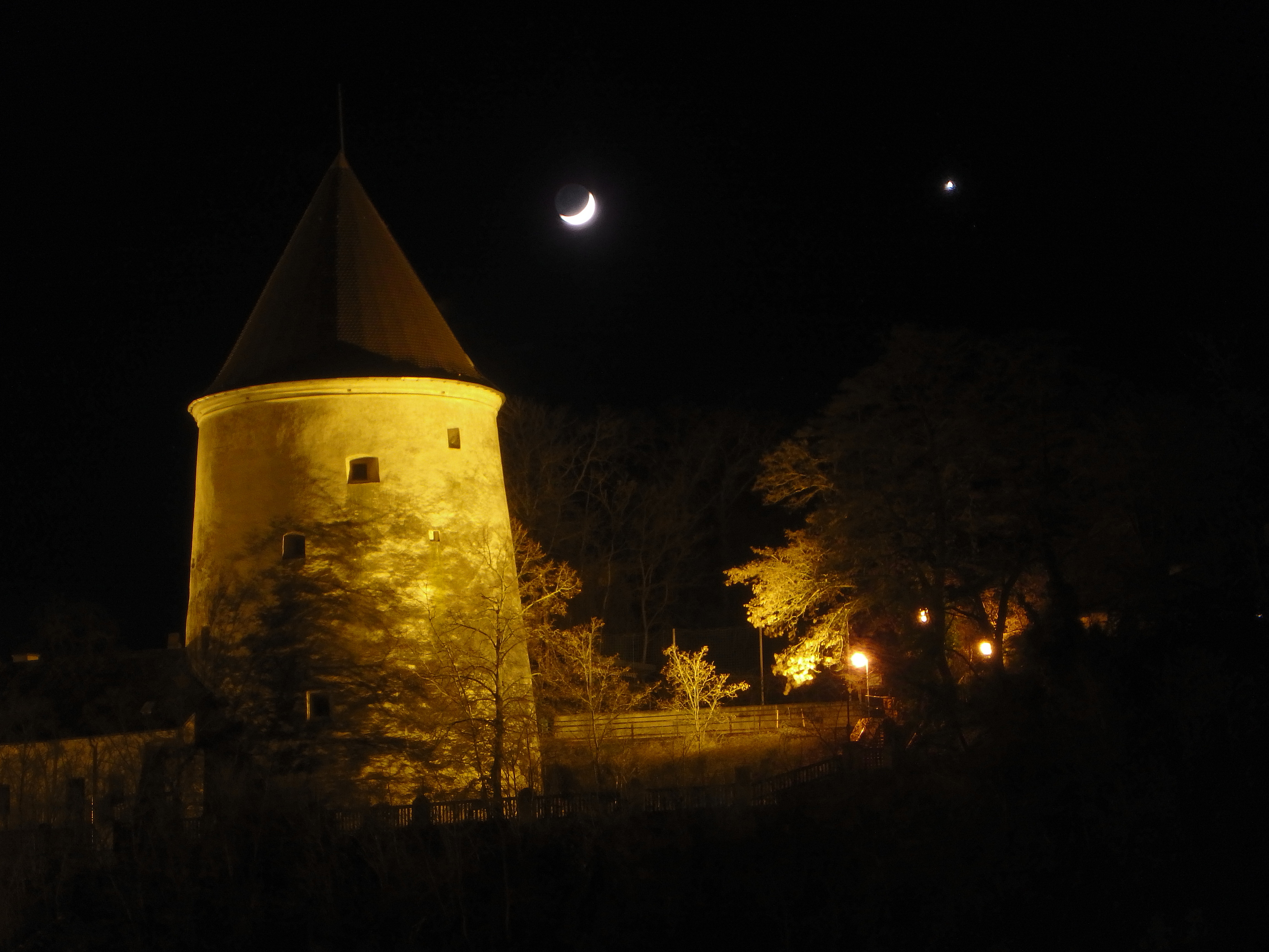 Eben noch nebelig grau, klarte es plötzlich auf mit kräftigen Windböen und als ich vor die Haustüre trat sah ich, dass neben einem der Wahrzeichen von Krems a.d. Donau, Niederösterreich, schön der Mond mit Erdlicht und die Venus plaziert waren. Also schnell den Fotoapparat geholt …