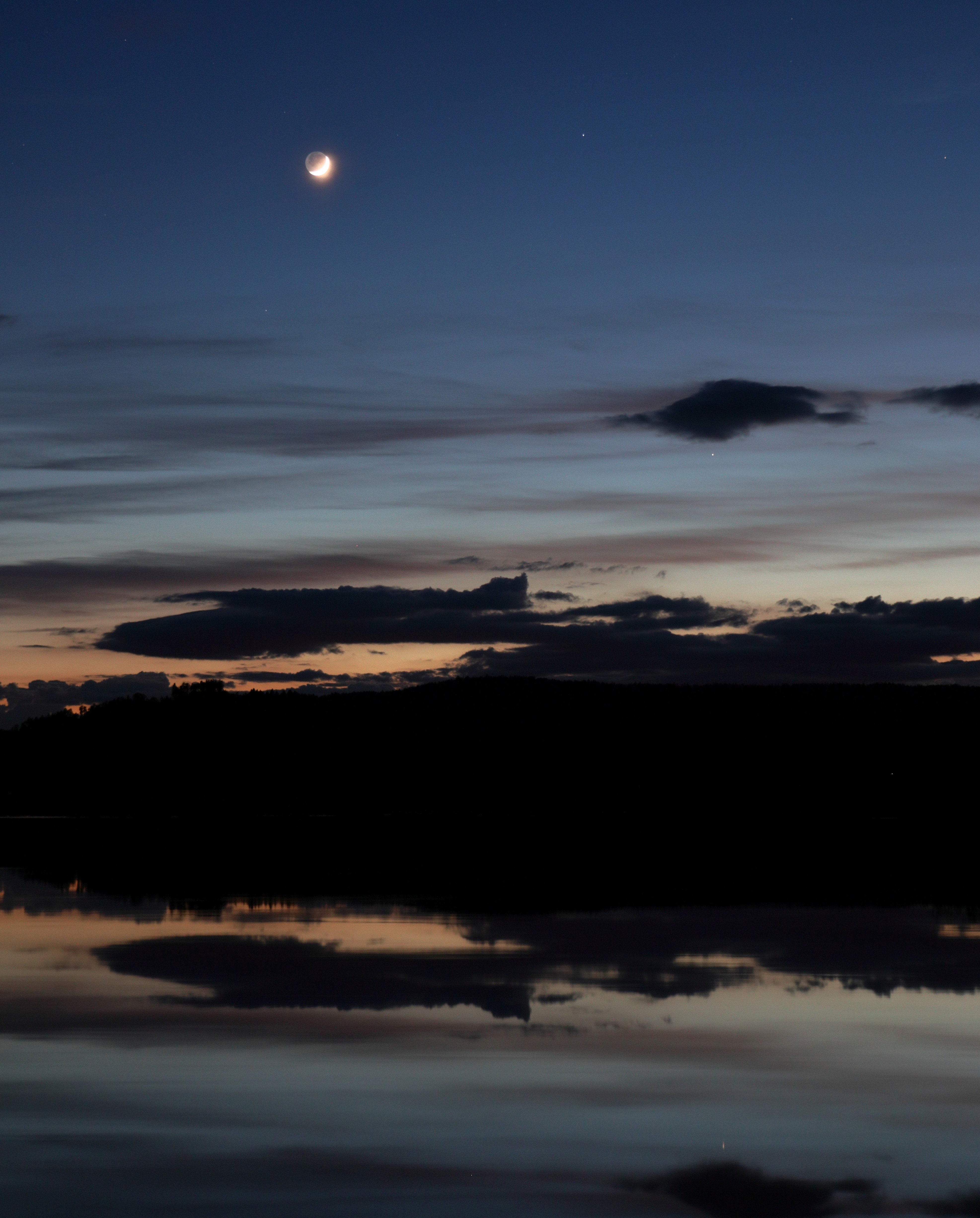 Leserbilder Astronomie: Mond mit Erdschein und Merkur mit Spiegelbild im Inn-Stausee