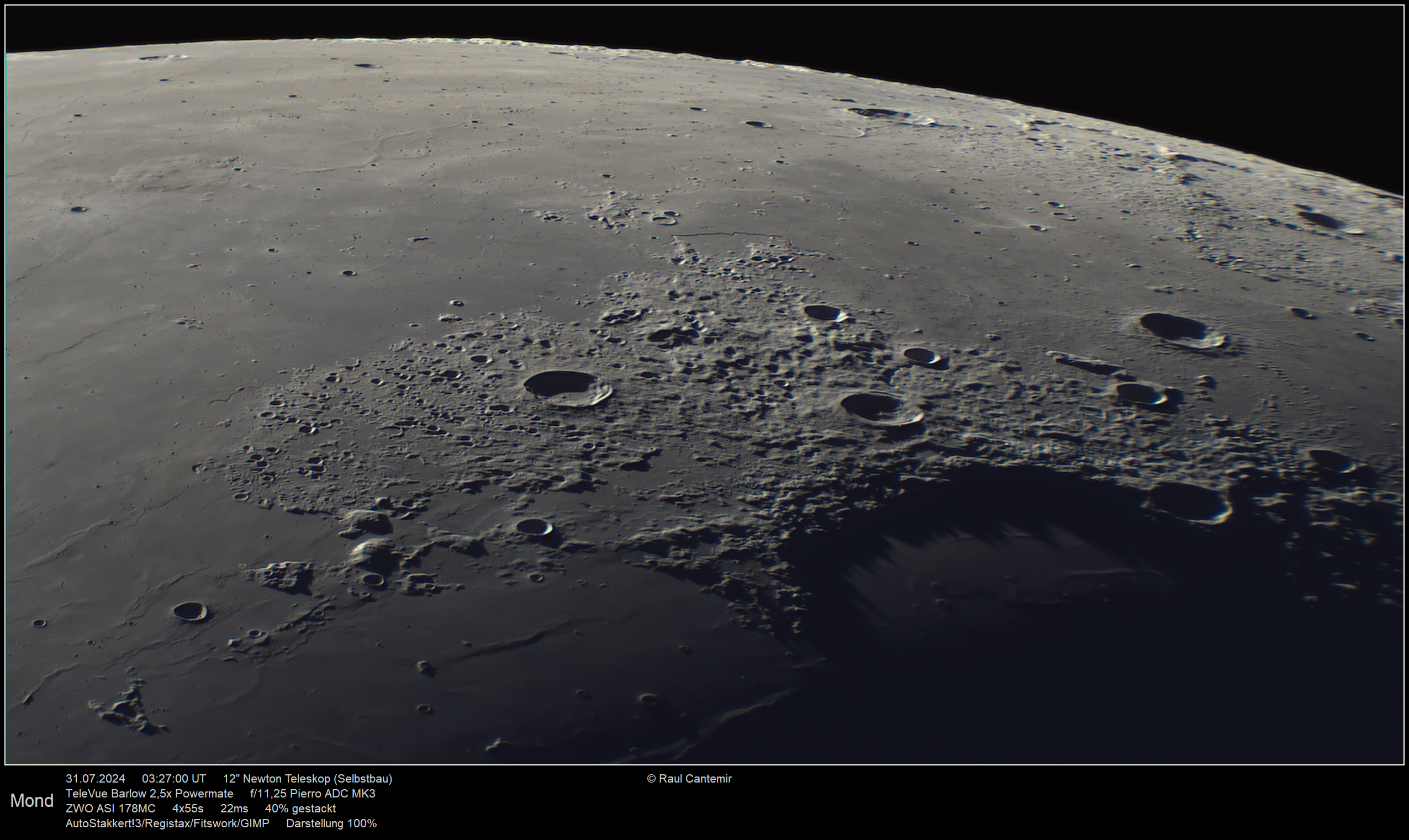 Dieses Bild zeigt unter anderem den Hauptkrater Mairan mit seinen 12 Nebenkratern. Mairan befindet sich in einem Librationsgebiet und hat einen Durchmesser von 40 Kilometer. Der größenmäßig vergleichbare Krater Sharp liegt in nord-nordöstlicher Richtung. Die Rille Rima Mairan, die über eine Strecke von etwa 100 Kilometern von Norden nach Süden verläuft, ist deutlich zu sehen. Das Bild wurde mit einer ZWO 178MC Farbkamera und einem Newton Teleskop mit 300 mm Öffnung aufgenommen.