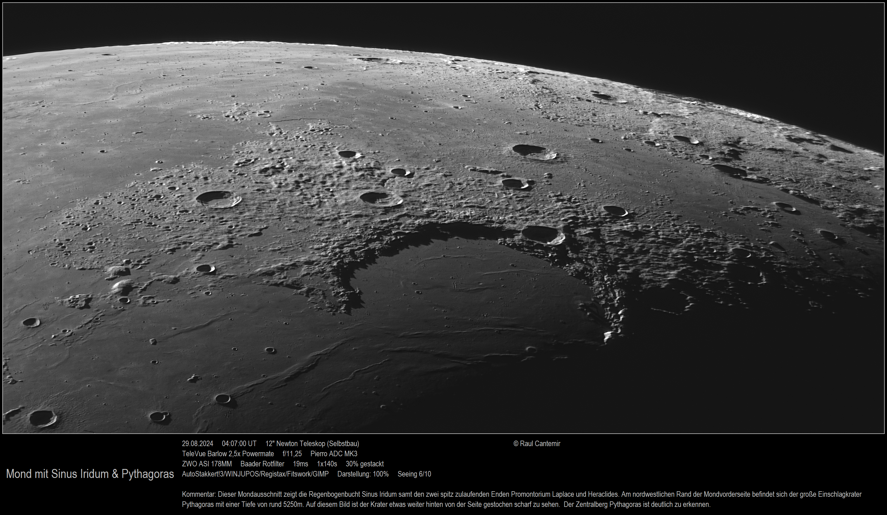 Dieser Mondausschnitt zeigt die Regenbogenbucht Sinus Iridum samt den zwei spitz zulaufenden Enden Promontorium Laplace und Heraclides. Am nordwestlichen Rand der Mondvorderseite befindet sich der große Einschlagkrater Pythagoras mit einer Tiefe von rund 5250 m. Auf diesem Bild ist der Krater etwas weiter hinten von der Seite gestochen scharf zu sehen. Der Zentralberg von Pythagoras ist deutlich zu erkennen.