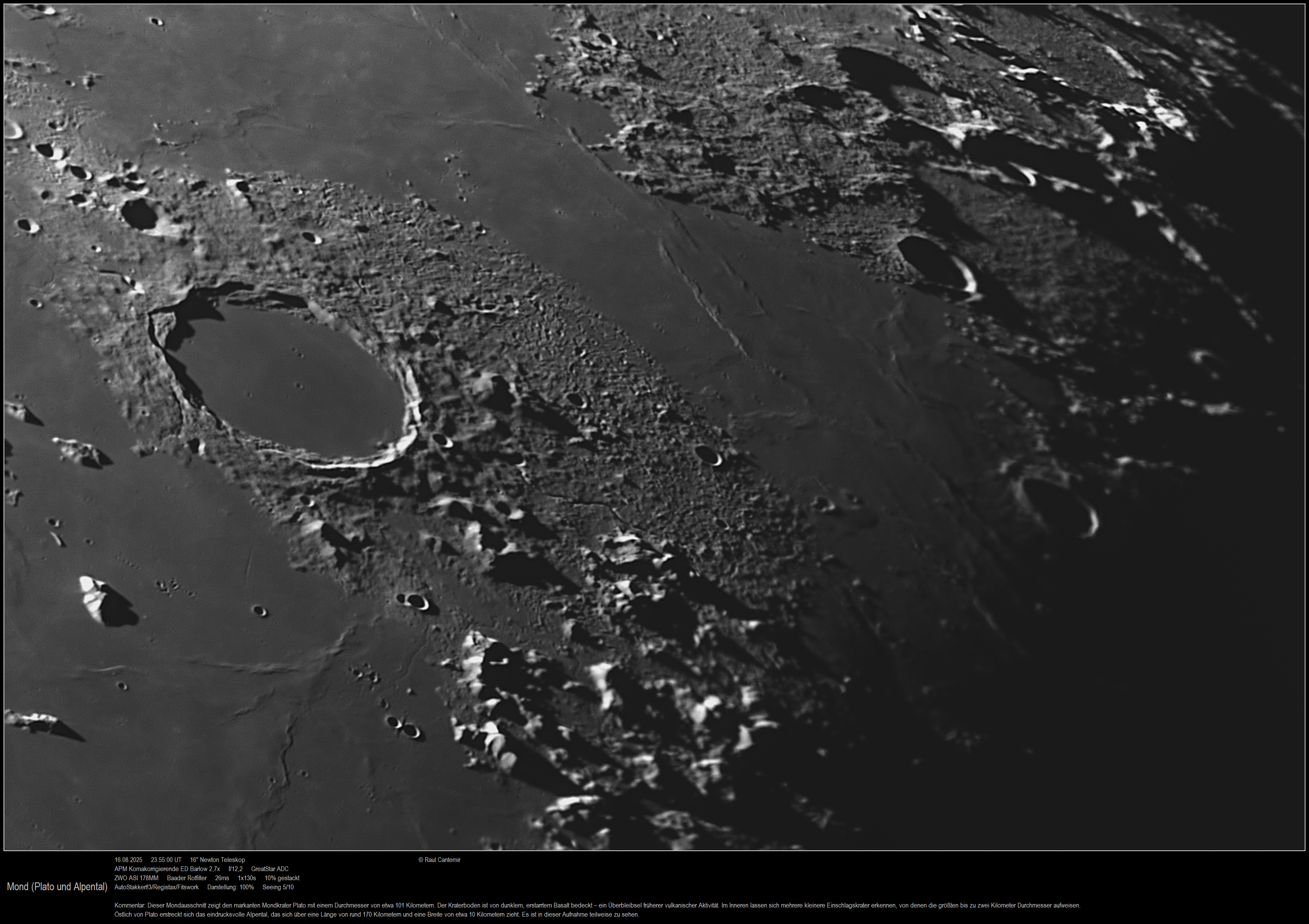 Dieser Mondausschnitt mit einer schönen Perspektive zeigt den markanten Mondkrater Plato mit einem Durchmesser von etwa 101 Kilometern. Der Kraterboden ist von dunklem, erstarrtem Basalt bedeckt – ein Überbleibsel früherer vulkanischer Aktivität. Im Inneren lassen sich mehrere kleinere Einschlagskrater erkennen, von denen die größten bis zu zwei Kilometer Durchmesser aufweisen. Östlich von Plato erstreckt sich das eindrucksvolle Alpental, das sich über eine Länge von rund 170 Kilometern und eine Breite von etwa 10 Kilometern zieht. Es ist in dieser Aufnahme teilweise zu sehen.