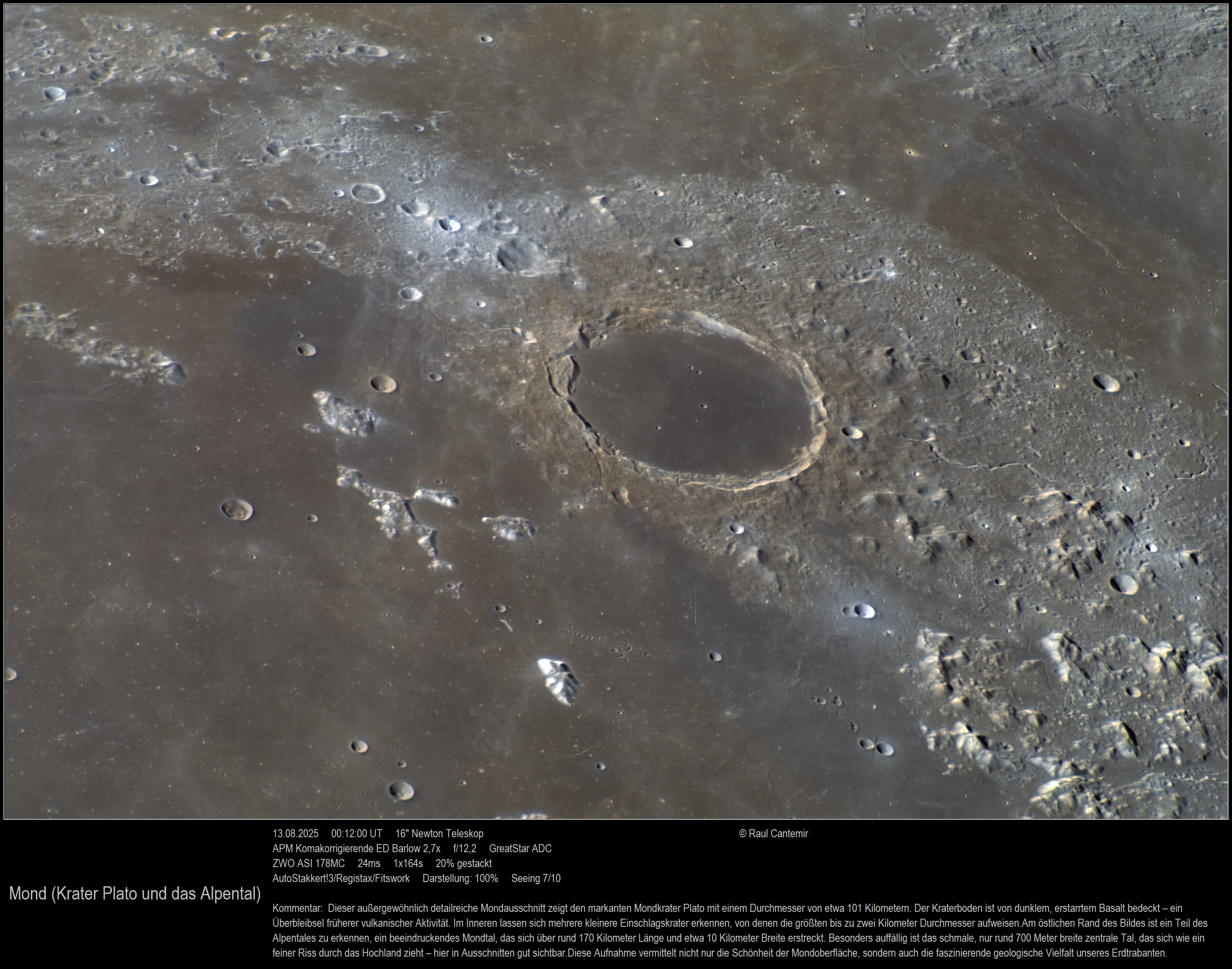 Diese außergewöhnlich detailreiche Farbaufnahme des Mondes zeigt den markanten Krater Plato, der einen Durchmesser von etwa 101 Kilometern aufweist. Sein dunkler, glatter Boden besteht aus erstarrtem Basalt – ein Überbleibsel früher vulkanischer Aktivität. Im Inneren sind mehrere kleinere Einschlagskrater zu erkennen, von denen die größten bis zu zwei Kilometer messen. Am östlichen Bildrand ist ein Teil des Alpentals (Vallis Alpes) zu sehen – eine beeindruckende geologische Struktur, die sich über rund 170 Kilometer Länge und etwa 10 Kilometer Breite erstreckt. Besonders auffällig ist das zentrale, nur etwa 700 Meter breite Rillensystem, das sich durch das Tal zieht. In dieser farbverstärkten Aufnahme ist es in Ausschnitten gut sichtbar. Die Farbverarbeitung hebt nicht nur die ästhetische Wirkung hervor, sondern macht auch feine Unterschiede in der Oberflächenzusammensetzung sichtbar – und bietet damit einen faszinierenden Einblick in die geologische Vielfalt und Geschichte unseres Mondes.