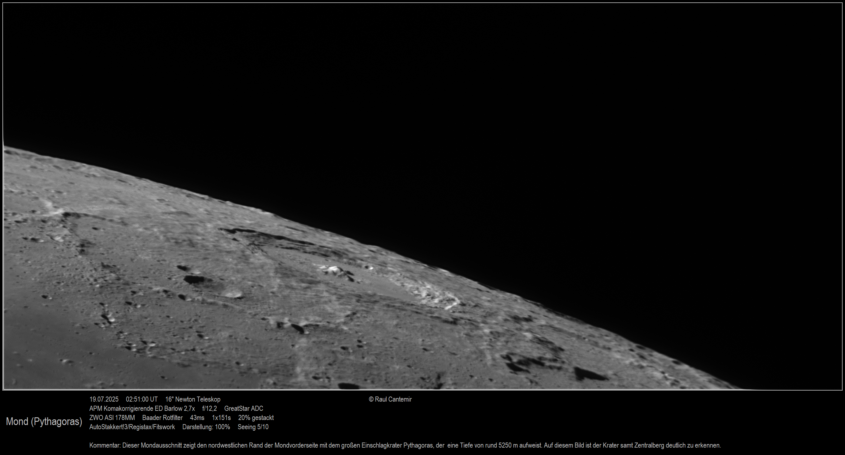 Dieser Mondausschnitt zeigt den nordwestlichen Rand der Mondvorderseite mit dem großen Einschlagkrater Pythagoras, der eine Tiefe von rund 5250 m aufweist. Auf diesem Bild ist der Krater samt Zentralberg deutlich zu erkennen. Dies ist eines meiner ersten Bilder mit meinem neuen Newton-16-Zoll-Teleskop. Das Teleskop ist in Gitterrohr-Bauweise aufgebaut und besteht aus Aluminium- und Carbonteilen.