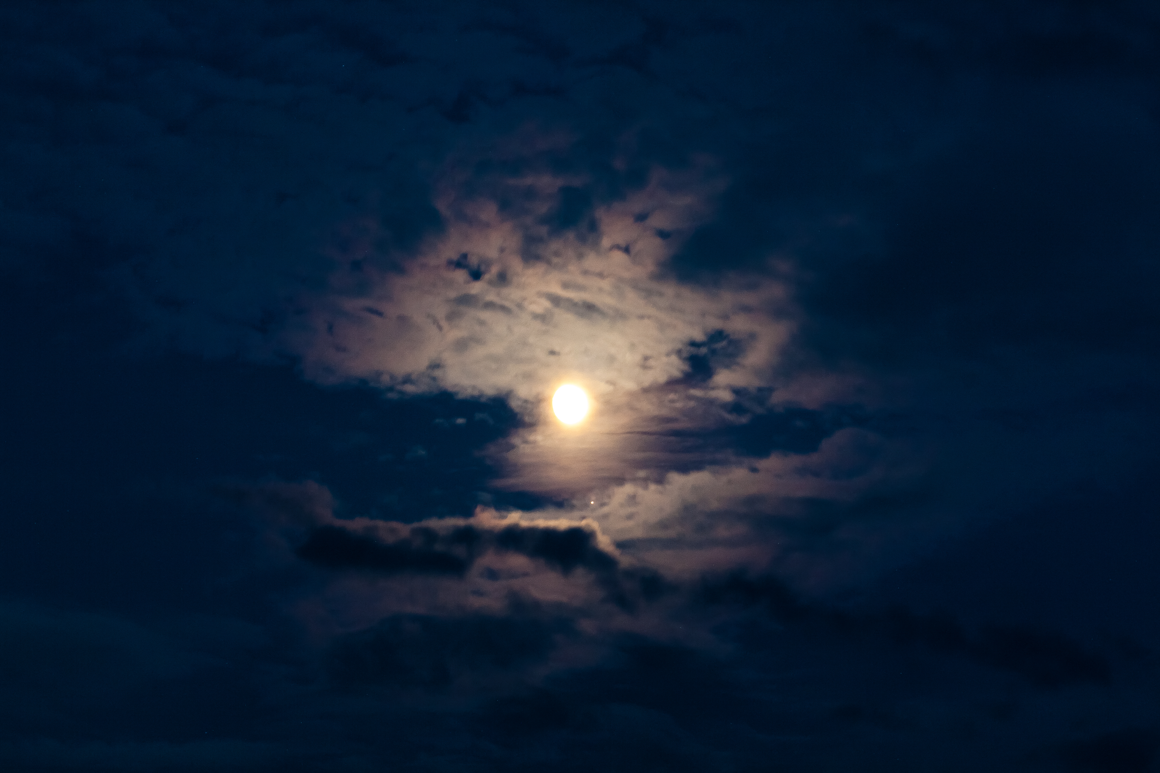 Das monatliche Treffen von Jupiter und Mond durch eine kleine Wolkenlücke.