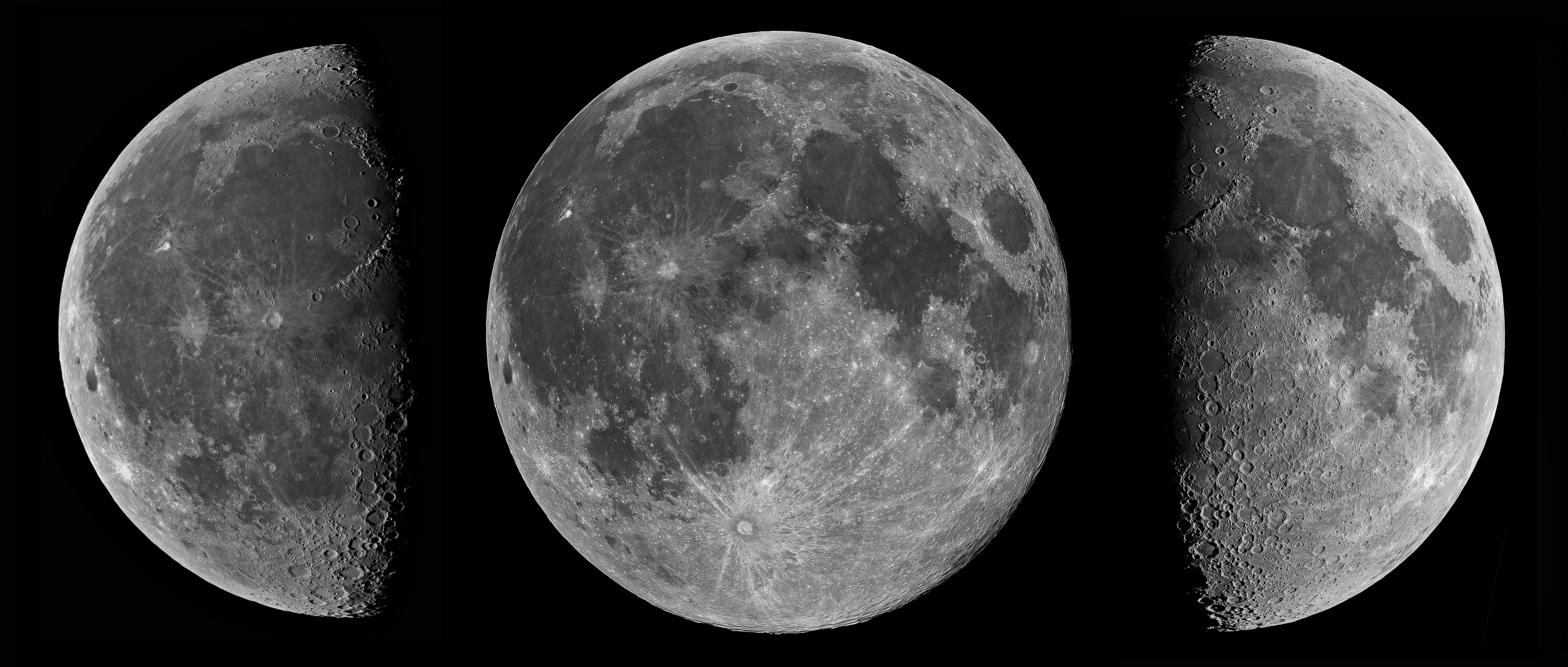 Bedingt durch Phasenwinkel und Libration verändert sich die Oberfläche des Mondes ständig. Besonders Krater mit ihren Schattenwürfen wechseln eindrucksvoll ihr Aussehen. Dies ist hier für drei Mondalter (von links 21, 15 und 8 Tage) dargestellt.