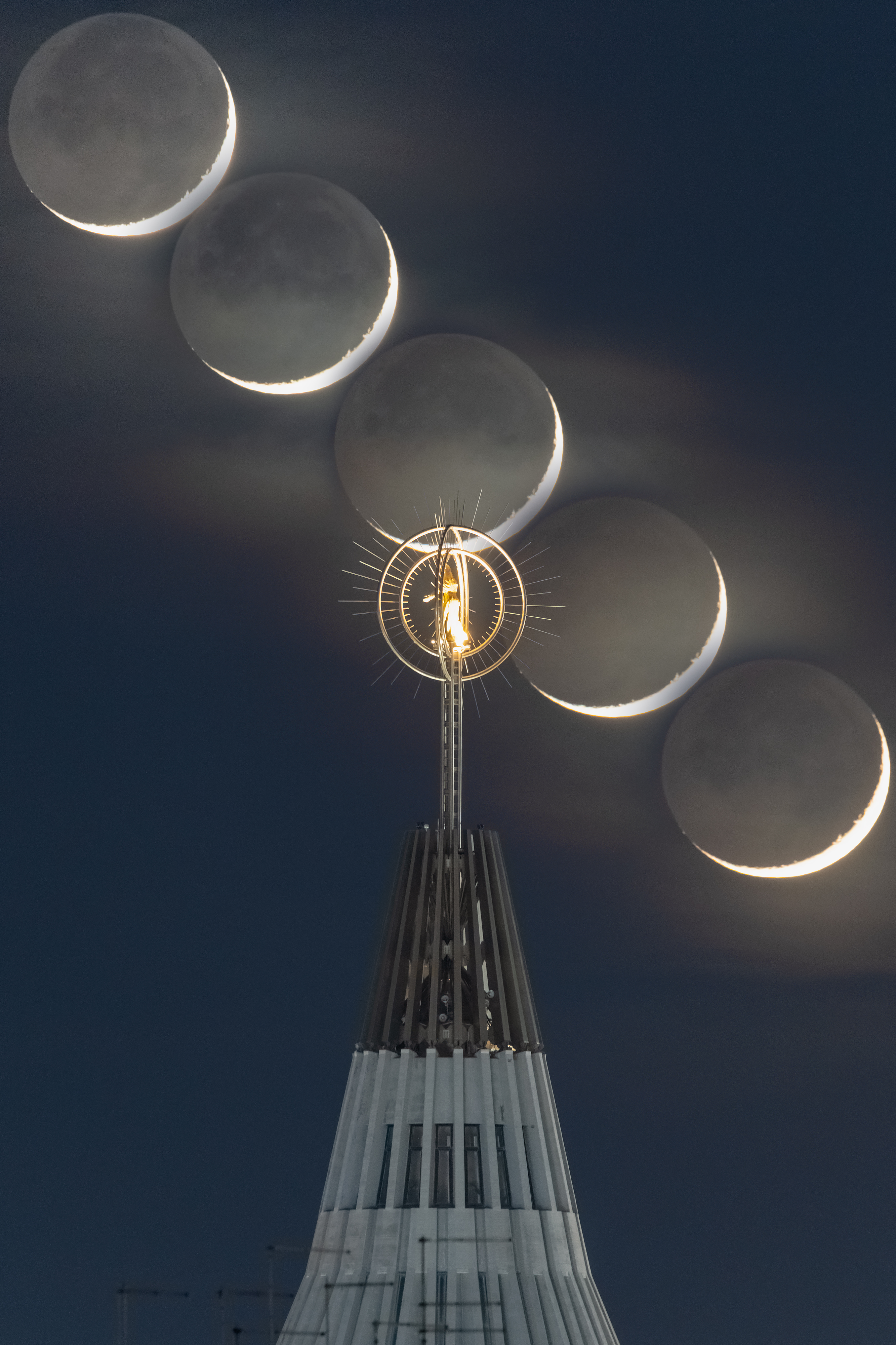 This image show the crescent Moon illuminated at 7% with the Moon in Earth shine, crossing the apex of the Sanctuary of the "Madonna delle Lacrime" in Syracuse, Italy. The image is a multiple exposure of 5 shots.