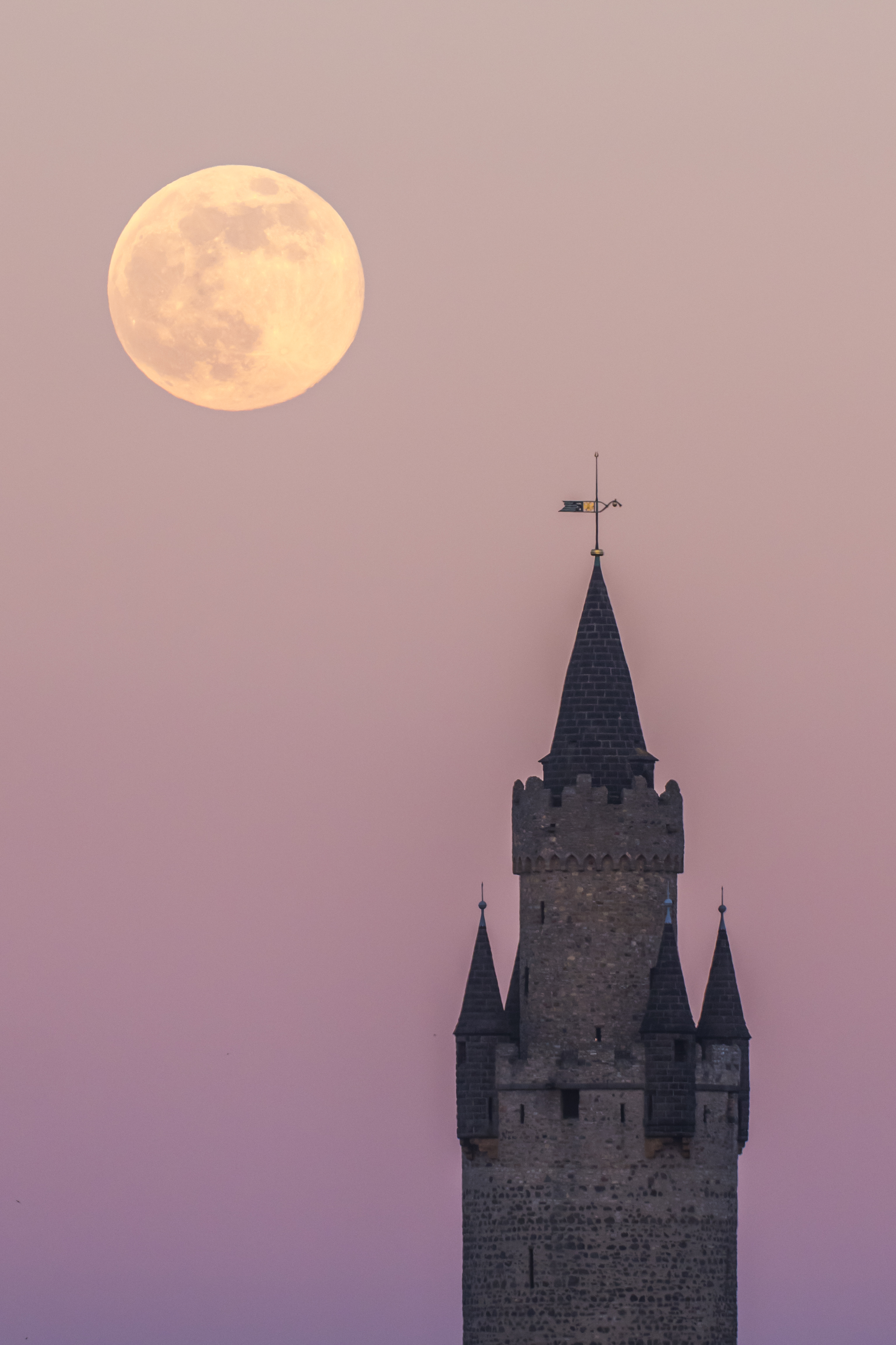 Am Abend des 10. Mai 2017 versprach die Wettervorhersage klares Wetter und die Ephemeridensoftware einen spektakulären Mondaufgang in der goldenen Stunde. Ich wählte als Aufnahmestandort ein Feld außerhalb von Friedberg (Hessen), von dem aus man den Mond neben dem historischen Adolfsturm sehen konnte. Ich war spät dran und hatte mich mit dem Bildwinkel etwas verschätzt, doch das Foto wurde gut!